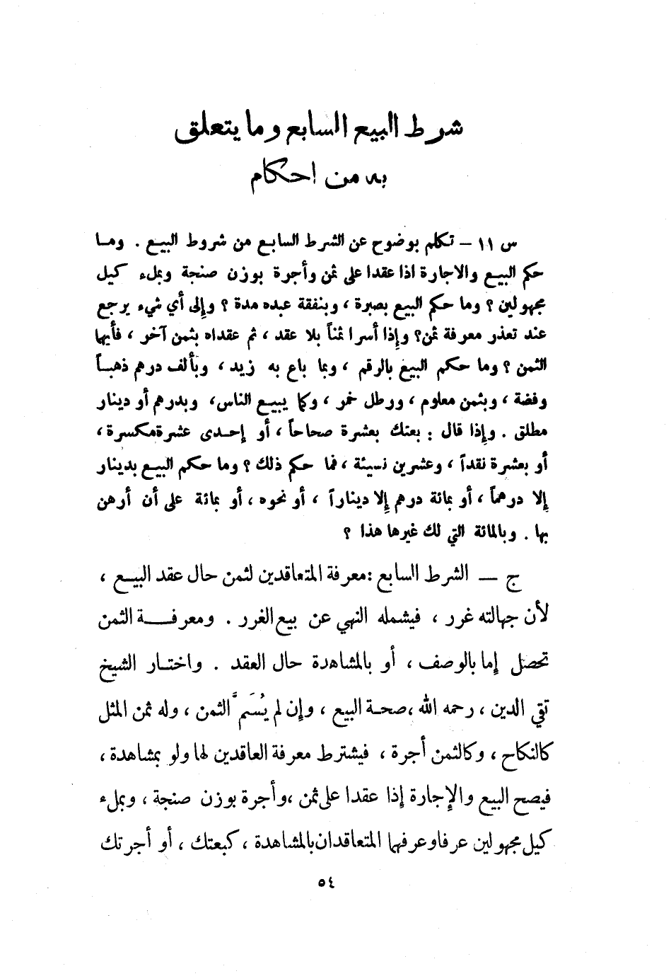 ومن شرطه علمُ المبيع برؤيةٍ ... أو الوصف إن يحصلْ به علمُ مقصدِ