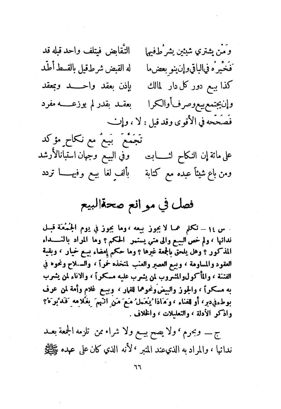 الأولى: من باع معلومًا ومجهولاً لم يتعذر علمه، كهذا العبد، وثوب غير معين؛ صح البيع في المعلوم بقسطه من الثمن، وبطل في المجهول؛ لأن المعلوم صدر فيه من أهله بشرطه، ومعرفته ممكنة بتقسيط الثمن على كل منهما وهو ممكن؛ فإن تعذر علم المجهول، ولم يبين ثمن المعلوم، كبعتك هذه الفرس وما في بطن الفرس الأخرى بكذا، لم يصح؛ لأن المجهول لا يصح بيعه لجهالته، والمعلوم مجهول الثمن ولا سبيل إلى معرفته؛ لأنها إنما تكون بتقسيط الثمن عليهما والمجهول لا يمكن تقويمه؛ فإن بين ثمن كل منهما صح في المعلوم بثمنه.