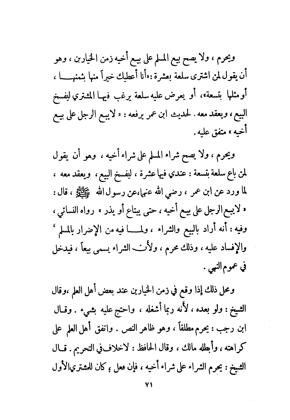 ومحل تحريم البيع والشراء إن لم تكن ضرورة أو حاجة؛ فإن كانت لم يحرم، كمضطر إلى طعام أو شراب يباع، فله شراؤه لحاجته، وكذا عريان وجد سترة، فله شراؤها، وكفن، ومؤنة تجهيز لميت خيف فساده بتأخير تجهيزه، وكوجود أبيه أو نحوه، يُباع