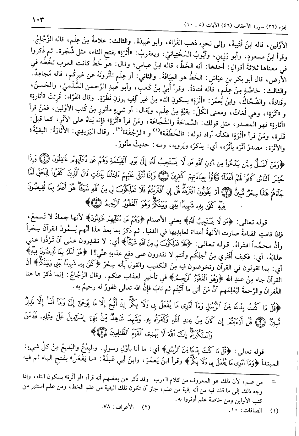 والثالث: خاصَّة مِنْ عِلْم، قاله قتادة. وقرأ أُبيُّ بن كعب، وأبو عبد الرحمن السلمي، والحسن، وقتادة، والضحاك، وابن يعمر: «أثْرَةٍ» بسكون الثاء من غير ألف بوزن نَظْرَةٍ. وقال الفراء: قرئت «أثارةٍ» و «أثَرَةٍ» ، وهي لغات، ومعنى الكل: بقيَّة مِنْ عِلْم، ويقال: أو شيء مأثور من كتب الأولين، فمن قرأ «أثارةٍ» فهو المصدر، مثل قولك: السماحة والشجاعة، ومن قرأ «أثَرَةٍ» فإنه بناه على الأثَر، كما قيل: