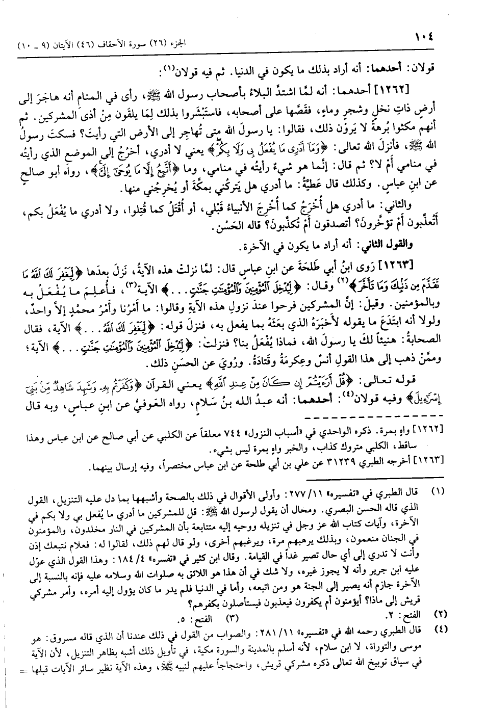 (1) قال الطبري في «تفسيره» 11/ 277: وأولى الأقوال في ذلك بالصحة وأشبهها بما دل عليه التنزيل، القول الذي قاله الحسن البصري. ومحال أن يقول لرسول الله صلّى الله عليه وسلّم: قل للمشركين ما أدري ما يفعل بي ولا بكم في الآخرة، وآيات كتاب الله عز وجل في تنزيله ووحيه إليه متتابعة بأن المشركين في النار مخلدون، والمؤمنون في الجنان منعمون، وبذلك يرهبهم مرة، ويرغبهم أخرى، ولو قال لهم ذلك، لقالوا له: فعلام نتبعك إذن وأنت لا تدري إلى أي حال تصير غدا في القيامة. وقال ابن كثير في «تفسره» 4/ 184: وهذا القول الذي عوّل عليه ابن جرير وأنه لا يجوز غيره، ولا شك في أن هذا هو اللائق به صلوات الله وسلامه عليه فإنه بالنسبة إلى الآخرة جازم أنه يصير إلى الجنة هو ومن اتبعه، وأما في الدنيا فلم يدر ما كان يؤول إليه أمره، وأمر مشركي قريش إلى ماذا؟ أيؤمنون أم يكفرون فيعذبون فيستأصلون بكفرهم؟