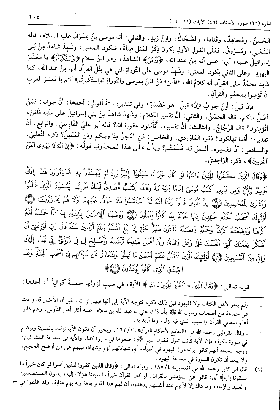 وَقالَ الَّذِينَ كَفَرُوا لِلَّذِينَ آمَنُوا لَوْ كانَ خَيْراً ما سَبَقُونا إِلَيْهِ وَإِذْ لَمْ يَهْتَدُوا بِهِ فَسَيَقُولُونَ هذا إِفْكٌ قَدِيمٌ (11) وَمِنْ قَبْلِهِ كِتابُ مُوسى إِماماً وَرَحْمَةً وَهذا كِتابٌ مُصَدِّقٌ لِساناً عَرَبِيًّا لِيُنْذِرَ الَّذِينَ ظَلَمُوا وَبُشْرى لِلْمُحْسِنِينَ (12) إِنَّ الَّذِينَ قالُوا رَبُّنَا اللَّهُ ثُمَّ اسْتَقامُوا فَلا خَوْفٌ عَلَيْهِمْ وَلا هُمْ يَحْزَنُونَ (13) أُولئِكَ أَصْحابُ الْجَنَّةِ خالِدِينَ فِيها جَزاءً بِما كانُوا يَعْمَلُونَ (14) وَوَصَّيْنَا الْإِنْسانَ بِوالِدَيْهِ إِحْساناً حَمَلَتْهُ أُمُّهُ كُرْهاً وَوَضَعَتْهُ كُرْهاً وَحَمْلُهُ وَفِصالُهُ ثَلاثُونَ شَهْراً حَتَّى إِذا بَلَغَ أَشُدَّهُ وَبَلَغَ أَرْبَعِينَ سَنَةً قالَ رَبِّ أَوْزِعْنِي أَنْ أَشْكُرَ نِعْمَتَكَ الَّتِي أَنْعَمْتَ عَلَيَّ وَعَلى والِدَيَّ وَأَنْ أَعْمَلَ صالِحاً تَرْضاهُ وَأَصْلِحْ لِي فِي ذُرِّيَّتِي إِنِّي تُبْتُ إِلَيْكَ وَإِنِّي مِنَ الْمُسْلِمِينَ (15)