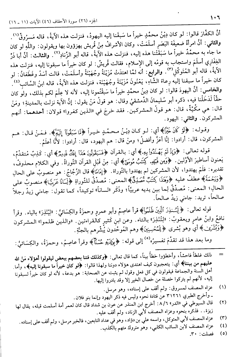 والثاني: أن امرأة ضعيفة البصر أسلمت، وكان الأشراف من قريش يهزئون بها ويقولون: واللهِ لو كان ما جاء به محمد خيراً ما سبقتْنا هذه إِليه، فنزلت هذه الآية، قاله أبو الزناد «2» . والثالث: أن أبا ذر الغفاري أسلم واستجاب به قومه إِلى الإِسلام، فقالت قريش: لو كان خيراً ما سبقونا إِليه، فنزلت هذه الآية، قاله أبو المتوكل «3» . والرابع: أنه لمّا اهتدت مُزَيْنَةَ وجُهَيْنَةُ وأسلمتْ، قالت أسَد وغَطَفان: لو كان خيراً ما سبقنا إِليه رِعاءُ الشَّاء، يعنون مُزَيْنَةَ وجُهَيْنَةَ، فنزلت هذه الآية، قاله ابن السائب «4» .