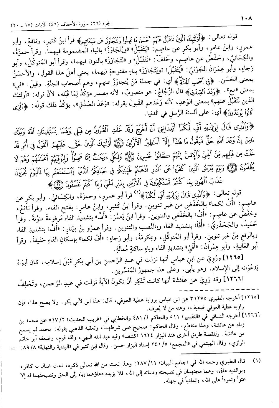 (1265) وروي عن ابن عباس أنها نزلت في عبد الرحمن بن أبي بكر قَبْلَ إِسلامه، كان أبواه يدعُوانه إِلى الإِسلام، وهو يأبى، وعلى هذا جمهور المفسرين.