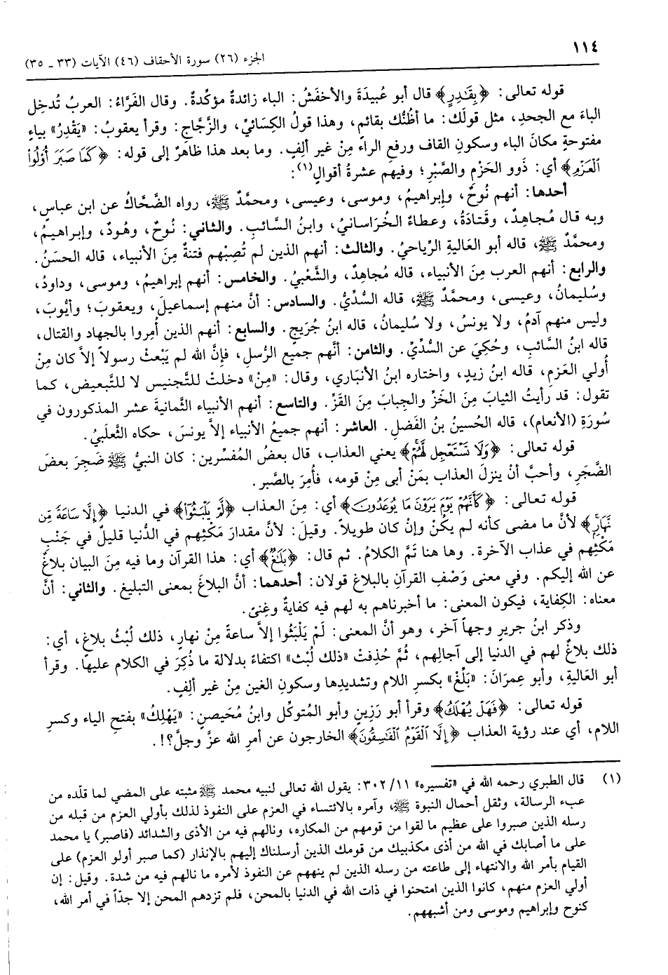 (1) قال الطبري رحمه الله في «تفسيره» 11/ 302: يقول الله تعالى لنبيه محمد صلّى الله عليه وسلّم مثبته على المضي لما قلّده من عبء الرسالة، وثقل أحمال النبوة صلّى الله عليه وسلّم، وآمره بالائتساء في العزم على النفوذ لذلك بأولي العزم من قبله من رسله الذين صبروا على عظيم ما لقوا من قومهم من المكاره، ونالهم فيه من الأذى والشدائد (فاصبر) يا محمد على ما أصابك في الله من أذى مكذبيك من قومك الذين أرسلناك إليهم بالإنذار (كما صبر أولو العزم) على القيام بأمر الله والانتهاء إلى طاعته من رسله الذين لم ينههم عن النفوذ لأمره ما نالهم فيه من شدة. وقيل: إن أولي العزم منهم، كانوا الذين امتحنوا في ذات الله في الدنيا بالمحن، فلم تزدهم المحن إلا جدّا في أمر الله، كنوح وإبراهيم وموسى ومن أشبههم.
