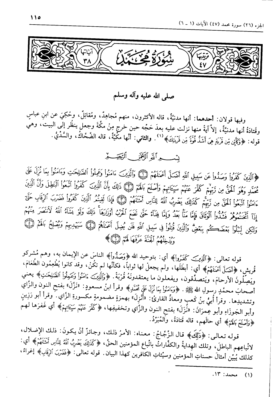 الَّذِينَ كَفَرُوا وَصَدُّوا عَنْ سَبِيلِ اللَّهِ أَضَلَّ أَعْمالَهُمْ (1) وَالَّذِينَ آمَنُوا وَعَمِلُوا الصَّالِحاتِ وَآمَنُوا بِما نُزِّلَ عَلى مُحَمَّدٍ وَهُوَ الْحَقُّ مِنْ رَبِّهِمْ كَفَّرَ عَنْهُمْ سَيِّئاتِهِمْ وَأَصْلَحَ بالَهُمْ (2) ذلِكَ بِأَنَّ الَّذِينَ كَفَرُوا اتَّبَعُوا الْباطِلَ وَأَنَّ الَّذِينَ آمَنُوا اتَّبَعُوا الْحَقَّ مِنْ رَبِّهِمْ كَذلِكَ يَضْرِبُ اللَّهُ لِلنَّاسِ أَمْثالَهُمْ (3) فَإِذا لَقِيتُمُ الَّذِينَ كَفَرُوا فَضَرْبَ الرِّقابِ حَتَّى إِذا أَثْخَنْتُمُوهُمْ فَشُدُّوا الْوَثاقَ فَإِمَّا مَنًّا بَعْدُ وَإِمَّا فِداءً حَتَّى تَضَعَ الْحَرْبُ أَوْزارَها ذلِكَ وَلَوْ يَشاءُ اللَّهُ لانْتَصَرَ مِنْهُمْ وَلكِنْ لِيَبْلُوَا بَعْضَكُمْ بِبَعْضٍ وَالَّذِينَ قُتِلُوا فِي سَبِيلِ اللَّهِ فَلَنْ يُضِلَّ أَعْمالَهُمْ (4)