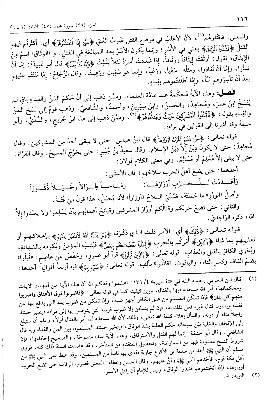 (1) قال ابن العربي رحمه الله في «تفسيره» 4/ 131: اعلموا وفقكم الله أن هذه الآية من أمهات الآيات ومحكماتها، أمر الله سبحانه فيها بالقتال، وبين كيفيته كما في قوله تعالى: فَاضْرِبُوا فَوْقَ الْأَعْناقِ وَاضْرِبُوا مِنْهُمْ كُلَّ بَنانٍ فإذا تمكّن المسلم من عنق الكافر أجهز عليه، وإذا تمكن من ضرب يده التي يدفع بها عن نفسه ويتناول قتال غيره فعل ذلك به، فإن لم يتمكن إلا ضرب فرسه التي يتوصل بها إلى مراده فيصير حينئذ راجلا مثله أو دونه، والمآل إعلاء كلمة الله تعالى، وذلك لأن الله سبحانه لما أمر بالقتال أولا، وعلم أن ستبلغ إلى الإثخان والغلبة بيّن سبحانه حكم الغلبة بشدّ الوثاق، فيتخير حينئذ المسلمون بين المن والفداء وبه قال الشافعي. وقال أبو حنيفة: إنما لهم القتل والاسترقاق، وهذه الآية عنده منسوخة. والصحيح إحكامها، فإن شروط النسخ معدومة فيها من المعارضة، وتحصيل المتقدم من المتأخر. وقد عضدت السنة ذلك كله، فروى مسلم أن النبيّ صلّى الله عليه وسلّم أخذ من سلمة بن الأكوع جارية ففدى بها ناسا من المسلمين، وقد هبط على النبيّ صلّى الله عليه وسلّم من أهل مكة قوم، فأخذهم النبيّ صلّى الله عليه وسلّم ومنّ عليهم. وقال الحسن وعطاء: المعنى فضرب الرقاب حتى تضع الحرب أوزارها، فإذا أثخنتموهم فشدوا الوثاق، وليس للإمام أن يقتل الأسير.