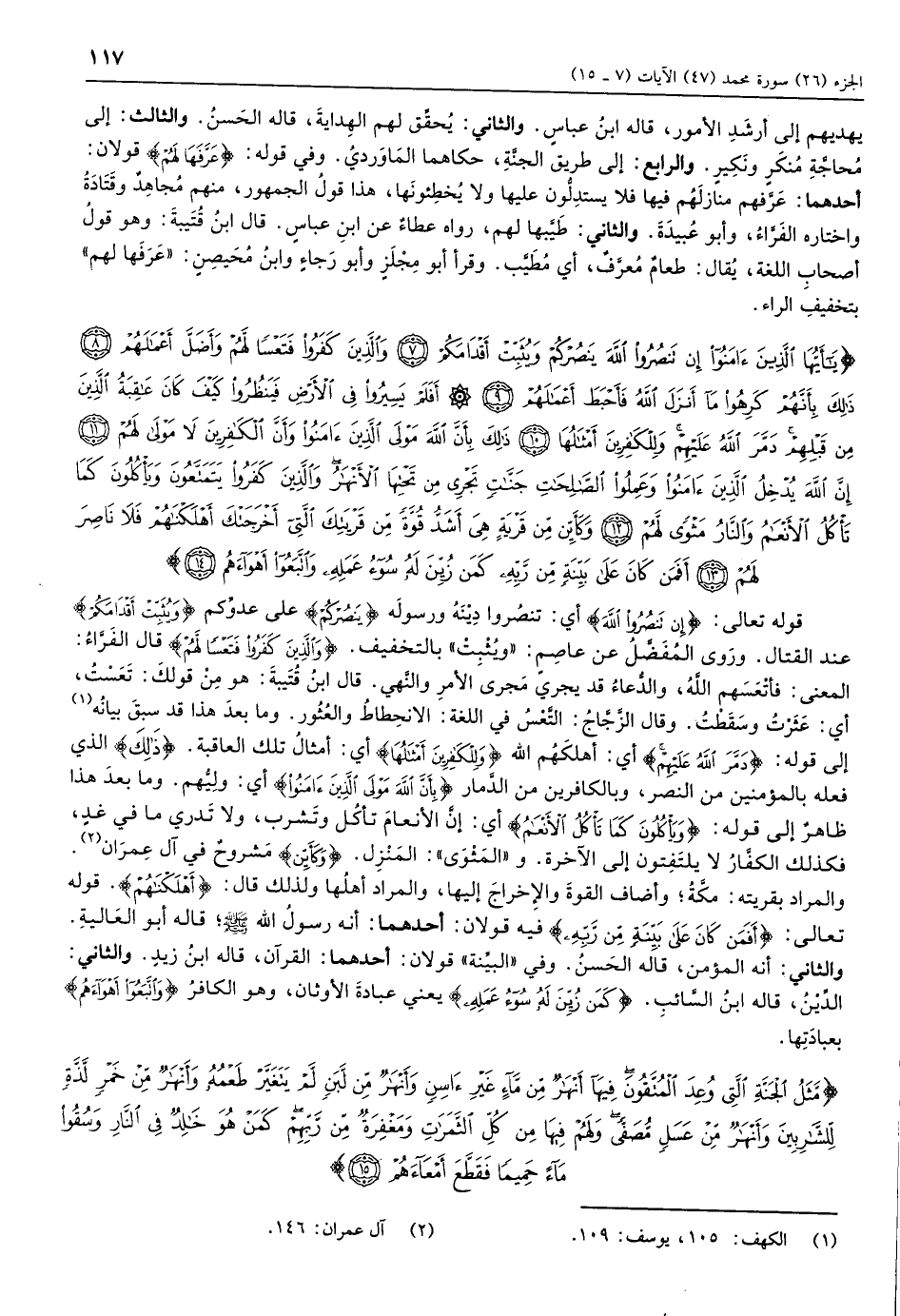 يا أَيُّهَا الَّذِينَ آمَنُوا إِنْ تَنْصُرُوا اللَّهَ يَنْصُرْكُمْ وَيُثَبِّتْ أَقْدامَكُمْ (7) وَالَّذِينَ كَفَرُوا فَتَعْساً لَهُمْ وَأَضَلَّ أَعْمالَهُمْ (8) ذلِكَ بِأَنَّهُمْ كَرِهُوا ما أَنْزَلَ اللَّهُ فَأَحْبَطَ أَعْمالَهُمْ (9) أَفَلَمْ يَسِيرُوا فِي الْأَرْضِ فَيَنْظُرُوا كَيْفَ كانَ عاقِبَةُ الَّذِينَ مِنْ قَبْلِهِمْ دَمَّرَ اللَّهُ عَلَيْهِمْ وَلِلْكافِرِينَ أَمْثالُها (10) ذلِكَ بِأَنَّ اللَّهَ مَوْلَى الَّذِينَ آمَنُوا وَأَنَّ الْكافِرِينَ لا مَوْلى لَهُمْ (11)