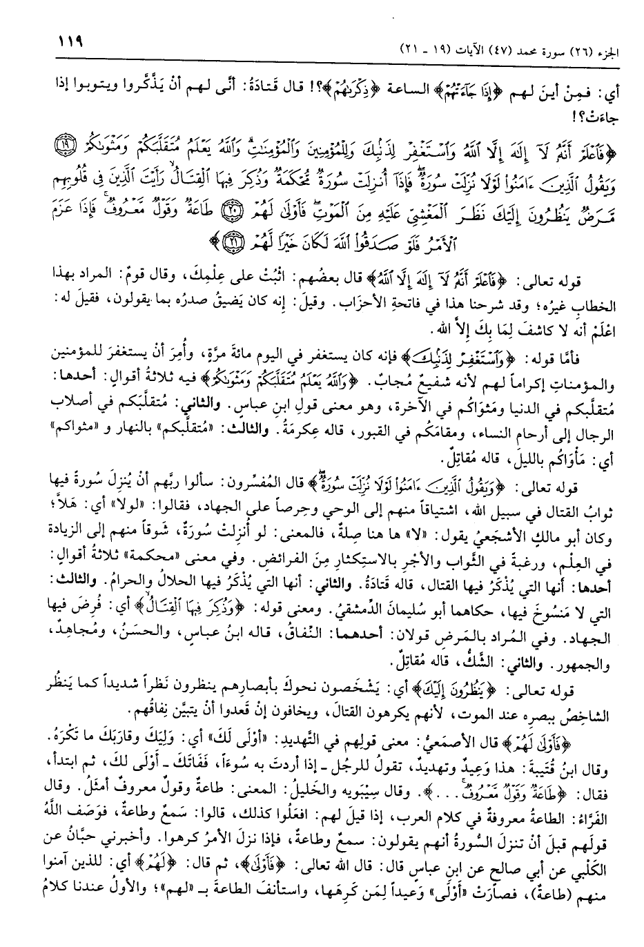 فَاعْلَمْ أَنَّهُ لا إِلهَ إِلاَّ اللَّهُ وَاسْتَغْفِرْ لِذَنْبِكَ وَلِلْمُؤْمِنِينَ وَالْمُؤْمِناتِ وَاللَّهُ يَعْلَمُ مُتَقَلَّبَكُمْ وَمَثْواكُمْ (19) وَيَقُولُ الَّذِينَ آمَنُوا لَوْلا نُزِّلَتْ سُورَةٌ فَإِذا أُنْزِلَتْ سُورَةٌ مُحْكَمَةٌ وَذُكِرَ فِيهَا الْقِتالُ رَأَيْتَ الَّذِينَ فِي قُلُوبِهِمْ مَرَضٌ يَنْظُرُونَ إِلَيْكَ نَظَرَ الْمَغْشِيِّ عَلَيْهِ مِنَ الْمَوْتِ فَأَوْلى لَهُمْ (20) طاعَةٌ وَقَوْلٌ مَعْرُوفٌ فَإِذا عَزَمَ الْأَمْرُ فَلَوْ صَدَقُوا اللَّهَ لَكانَ خَيْراً لَهُمْ (21)