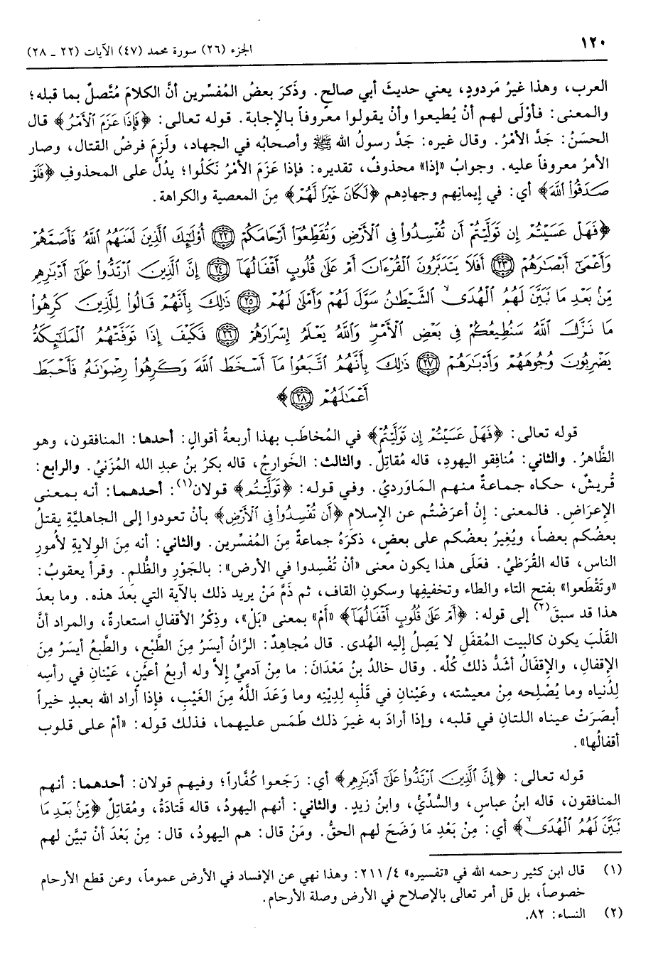فَهَلْ عَسَيْتُمْ إِنْ تَوَلَّيْتُمْ أَنْ تُفْسِدُوا فِي الْأَرْضِ وَتُقَطِّعُوا أَرْحامَكُمْ (22) أُولئِكَ الَّذِينَ لَعَنَهُمُ اللَّهُ فَأَصَمَّهُمْ وَأَعْمى أَبْصارَهُمْ (23) أَفَلا يَتَدَبَّرُونَ الْقُرْآنَ أَمْ عَلى قُلُوبٍ أَقْفالُها (24) إِنَّ الَّذِينَ ارْتَدُّوا عَلى أَدْبارِهِمْ مِنْ بَعْدِ ما تَبَيَّنَ لَهُمُ الْهُدَى الشَّيْطانُ سَوَّلَ لَهُمْ وَأَمْلى لَهُمْ (25) ذلِكَ بِأَنَّهُمْ قالُوا لِلَّذِينَ كَرِهُوا ما نَزَّلَ اللَّهُ سَنُطِيعُكُمْ فِي بَعْضِ الْأَمْرِ وَاللَّهُ يَعْلَمُ إِسْرارَهُمْ (26)