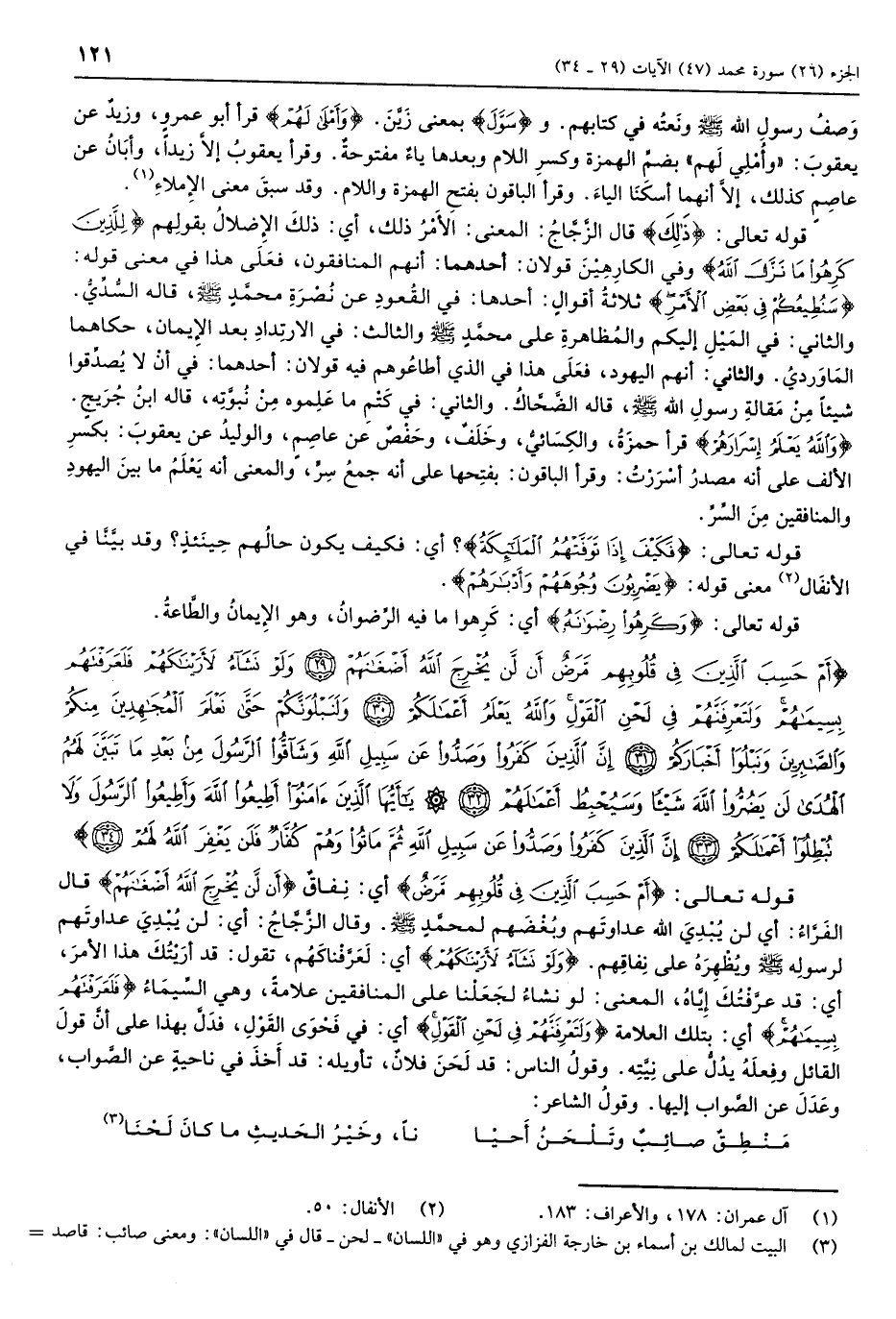 أَمْ حَسِبَ الَّذِينَ فِي قُلُوبِهِمْ مَرَضٌ أَنْ لَنْ يُخْرِجَ اللَّهُ أَضْغانَهُمْ (29) وَلَوْ نَشاءُ لَأَرَيْناكَهُمْ فَلَعَرَفْتَهُمْ بِسِيماهُمْ وَلَتَعْرِفَنَّهُمْ فِي لَحْنِ الْقَوْلِ وَاللَّهُ يَعْلَمُ أَعْمالَكُمْ (30) وَلَنَبْلُوَنَّكُمْ حَتَّى نَعْلَمَ الْمُجاهِدِينَ مِنْكُمْ وَالصَّابِرِينَ وَنَبْلُوَا أَخْبارَكُمْ (31) إِنَّ الَّذِينَ كَفَرُوا وَصَدُّوا عَنْ سَبِيلِ اللَّهِ وَشَاقُّوا الرَّسُولَ مِنْ بَعْدِ ما تَبَيَّنَ لَهُمُ الْهُدى لَنْ يَضُرُّوا اللَّهَ شَيْئاً وَسَيُحْبِطُ أَعْمالَهُمْ (32) يا أَيُّهَا الَّذِينَ آمَنُوا أَطِيعُوا اللَّهَ وَأَطِيعُوا الرَّسُولَ وَلا تُبْطِلُوا أَعْمالَكُمْ (33)