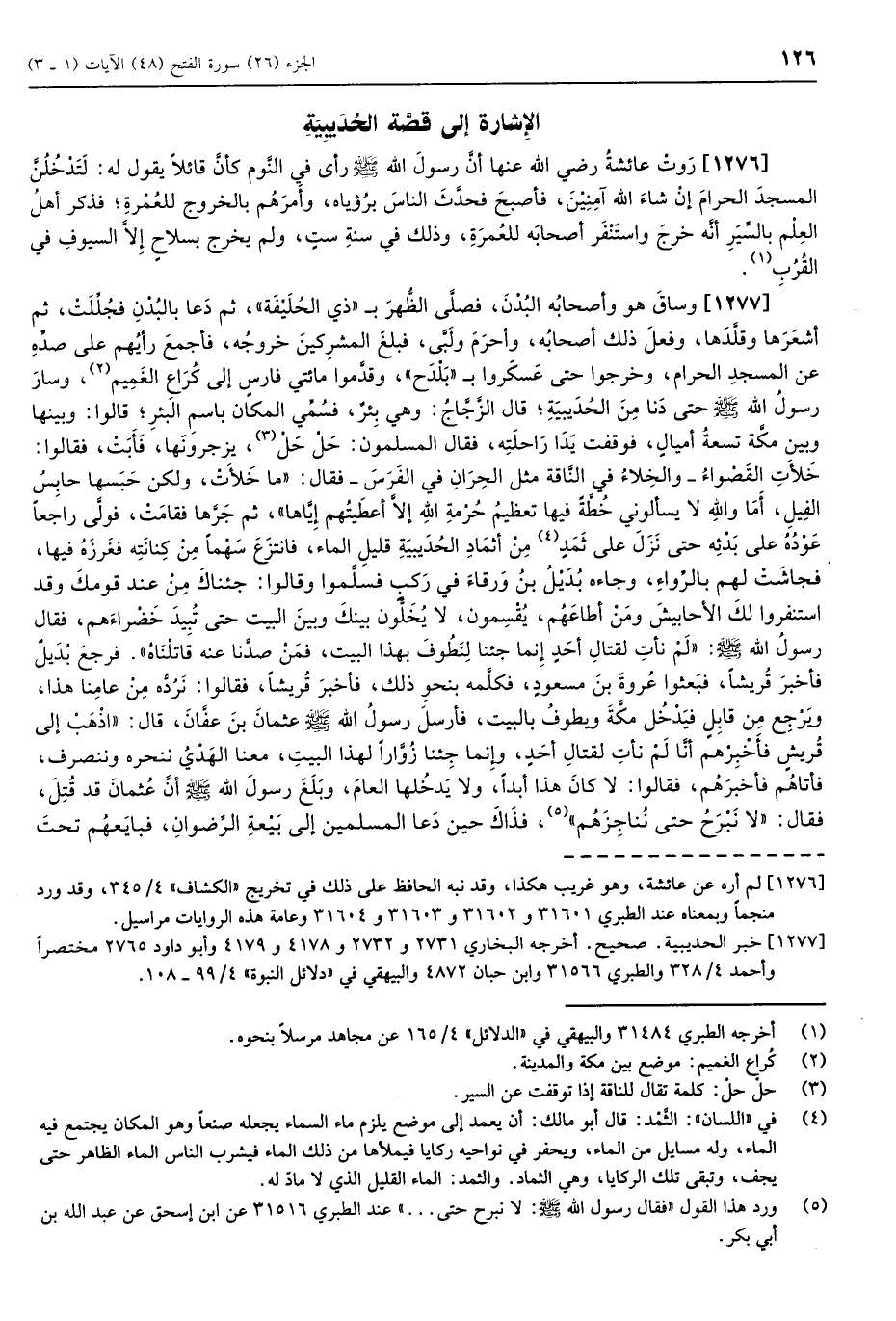 (1276) روت عائشة رضي الله عنها أنّ رسول الله صلّى الله عليه وسلّم رأى في النَّوم كأن قائلاً يقول له: لتدخلن المسجد الحرام إِن شاء الله آمنين، فأصبح فحدَّث الناس برؤياه، وأمرهم بالخروج للعُمْرة فذكر أهلُ العِلْم بالسِّيَرِ أنَّه خرج واستنفر أصحابَه للعمرة، وذلك في سنة ست، ولم يخرج بسلاح إِلاّ السيوف في القُرُب «1» .