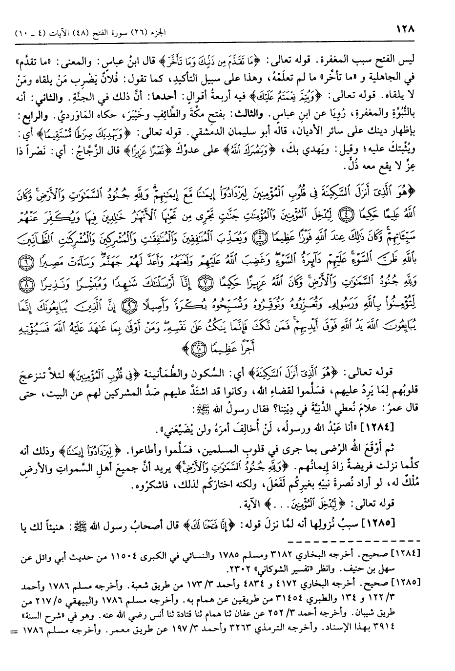 هُوَ الَّذِي أَنْزَلَ السَّكِينَةَ فِي قُلُوبِ الْمُؤْمِنِينَ لِيَزْدادُوا إِيماناً مَعَ إِيمانِهِمْ وَلِلَّهِ جُنُودُ السَّماواتِ وَالْأَرْضِ وَكانَ اللَّهُ عَلِيماً حَكِيماً (4) لِيُدْخِلَ الْمُؤْمِنِينَ وَالْمُؤْمِناتِ جَنَّاتٍ تَجْرِي مِنْ تَحْتِهَا الْأَنْهارُ خالِدِينَ فِيها وَيُكَفِّرَ عَنْهُمْ سَيِّئاتِهِمْ وَكانَ ذلِكَ عِنْدَ اللَّهِ فَوْزاً عَظِيماً (5) وَيُعَذِّبَ الْمُنافِقِينَ وَالْمُنافِقاتِ وَالْمُشْرِكِينَ وَالْمُشْرِكاتِ الظَّانِّينَ بِاللَّهِ ظَنَّ السَّوْءِ عَلَيْهِمْ دائِرَةُ السَّوْءِ وَغَضِبَ اللَّهُ عَلَيْهِمْ وَلَعَنَهُمْ وَأَعَدَّ لَهُمْ جَهَنَّمَ وَساءَتْ مَصِيراً (6) وَلِلَّهِ جُنُودُ السَّماواتِ وَالْأَرْضِ وَكانَ اللَّهُ عَزِيزاً حَكِيماً (7) إِنَّا أَرْسَلْناكَ شاهِداً وَمُبَشِّراً وَنَذِيراً (8)
