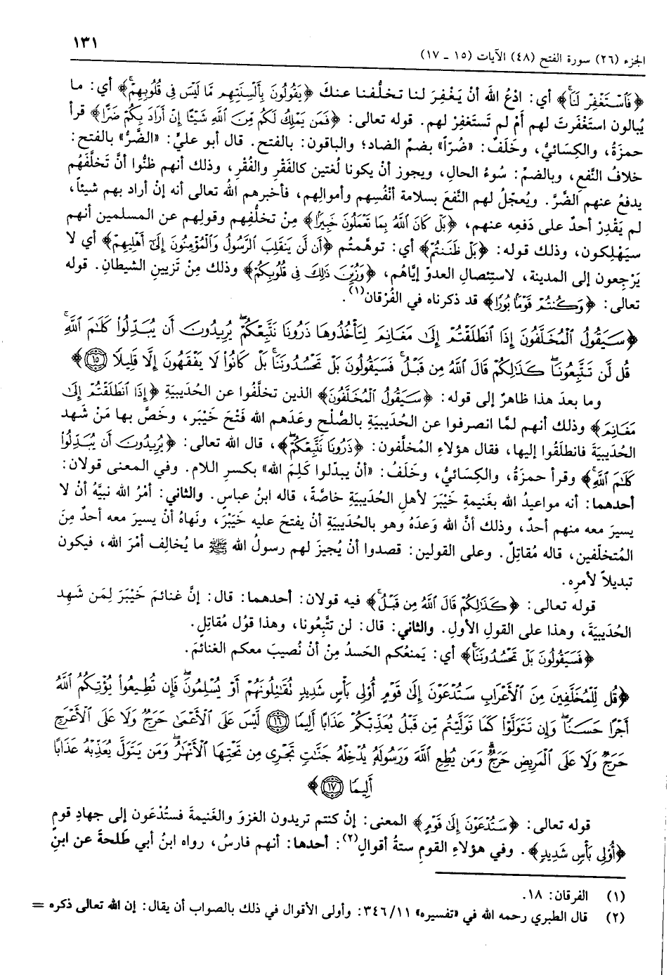 قُلْ لِلْمُخَلَّفِينَ مِنَ الْأَعْرابِ سَتُدْعَوْنَ إِلى قَوْمٍ أُولِي بَأْسٍ شَدِيدٍ تُقاتِلُونَهُمْ أَوْ يُسْلِمُونَ فَإِنْ تُطِيعُوا يُؤْتِكُمُ اللَّهُ أَجْراً حَسَناً وَإِنْ تَتَوَلَّوْا كَما تَوَلَّيْتُمْ مِنْ قَبْلُ يُعَذِّبْكُمْ عَذاباً أَلِيماً (16) لَيْسَ عَلَى الْأَعْمى حَرَجٌ وَلا عَلَى الْأَعْرَجِ حَرَجٌ وَلا عَلَى الْمَرِيضِ حَرَجٌ وَمَنْ يُطِعِ اللَّهَ وَرَسُولَهُ يُدْخِلْهُ جَنَّاتٍ تَجْرِي مِنْ تَحْتِهَا الْأَنْهارُ وَمَنْ يَتَوَلَّ يُعَذِّبْهُ عَذاباً أَلِيماً (17)
