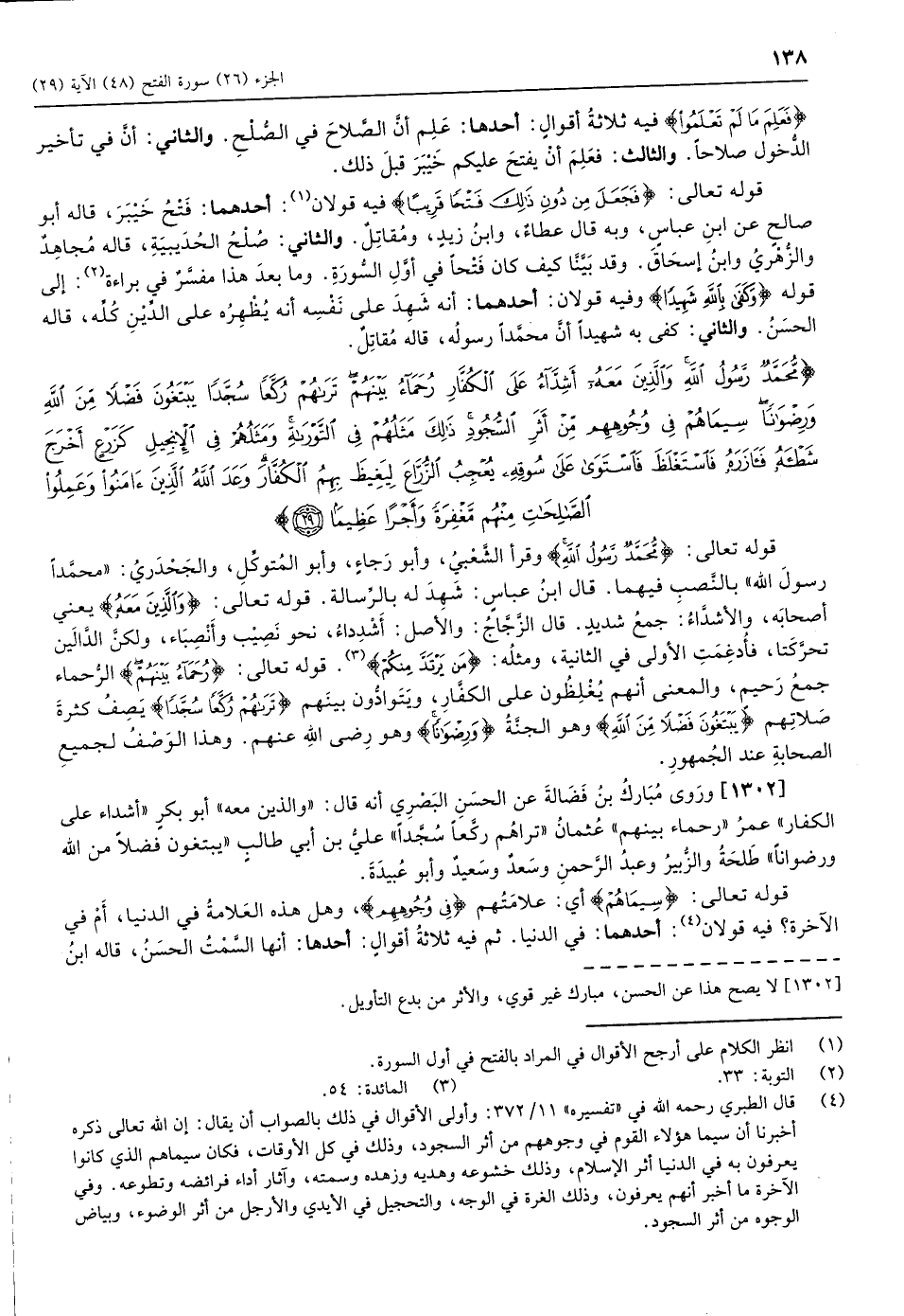 (4) قال الطبري رحمه الله في «تفسيره» 11/ 372: وأولى الأقوال في ذلك بالصواب أن يقال: إن الله تعالى ذكره أخبرنا أن سيما هؤلاء القوم في وجوههم من أثر السجود، وذلك في كل الأوقات، فكان سيماهم الذي كانوا يعرفون به في الدنيا أثر الإسلام، وذلك خشوعه وهديه وزهده وسمته، وآثار أداء فرائضه وتطوعه. وفي الآخرة ما أخبر أنهم يعرفون، وذلك الغرة في الوجه، والتحجيل في الأيدي والأرجل من أثر الوضوء، وبياض الوجوه من أثر السجود.