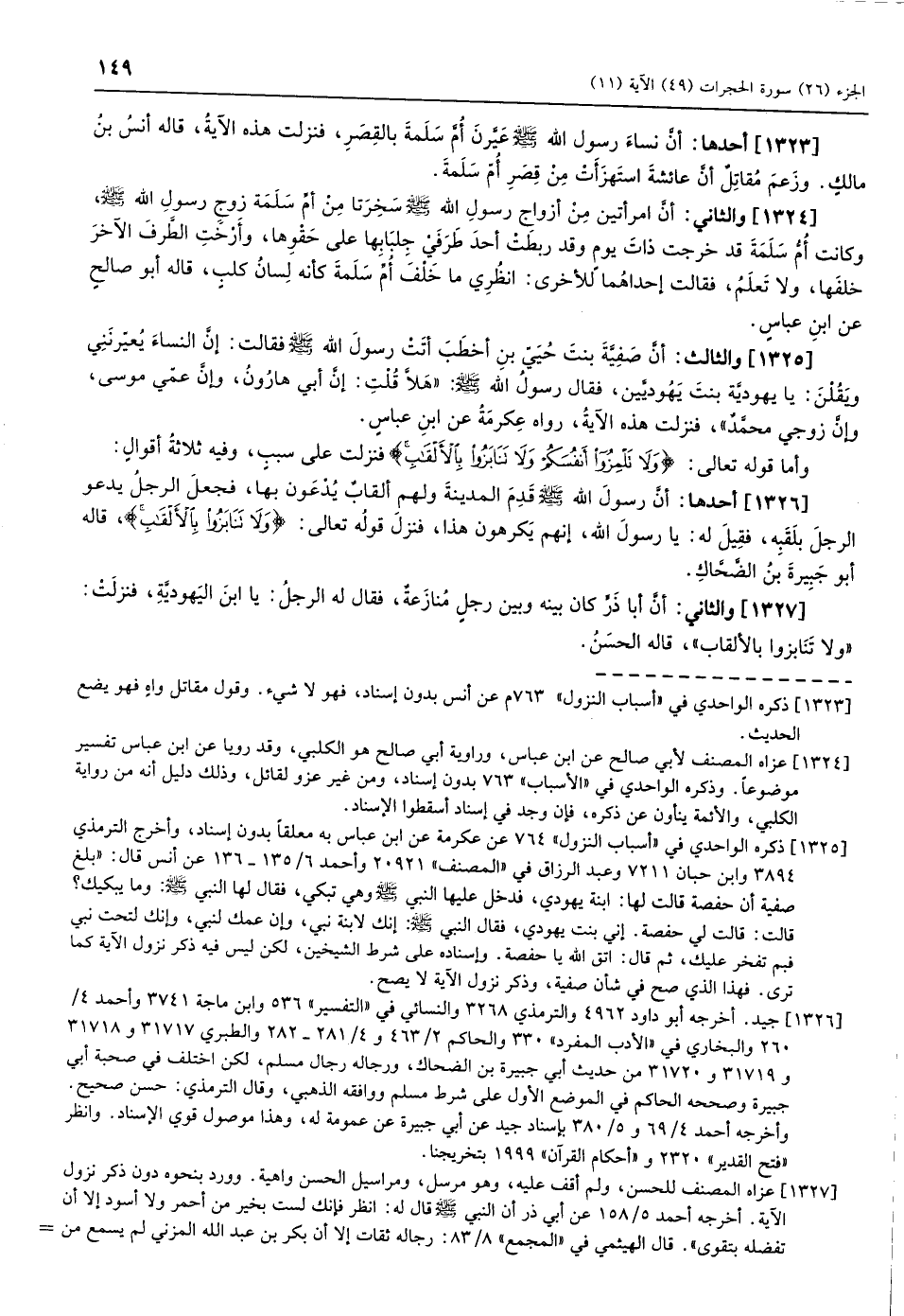 قالت: قالت لي حفصة. إني بنت يهودي، فقال النبي صلّى الله عليه وسلّم: إنك لابنة نبي، وإن عمك لنبي، وإنك لتحت نبي فبم تفخر عليك، ثم قال: اتق الله يا حفصة. وإسناده على شرط الشيخين، لكن ليس فيه ذكر نزول الآية كما ترى. فهذا الذي صح في شأن صفية، وذكر نزول الآية لا يصح.