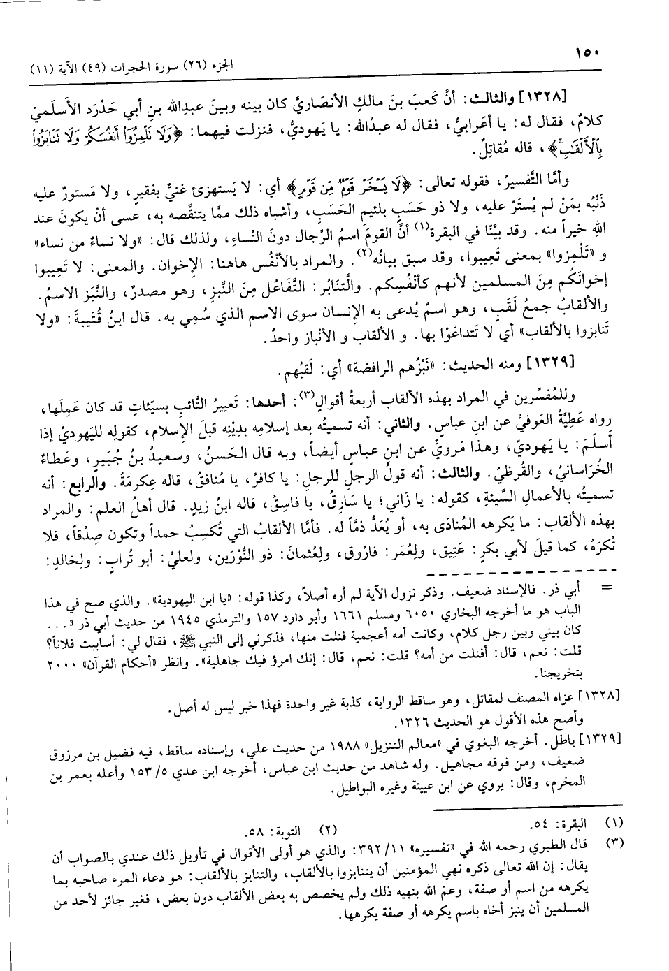 (3) قال الطبري رحمه الله في «تفسيره» 11/ 392: والذي هو أولى الأقوال في تأويل ذلك عندي بالصواب أن يقال: إن الله تعالى ذكره نهي المؤمنين أن يتنابزوا بالألقاب، والتنابز بالألقاب: هو دعاء المرء صاحبه بما يكرهه من اسم أو صفة، وعمّ الله بنهيه ذلك ولم يخصص به بعض الألقاب دون بعض، فغير جائز لأحد من المسلمين أن ينبز أخاه باسم يكرهه أو صفة يكرهها.