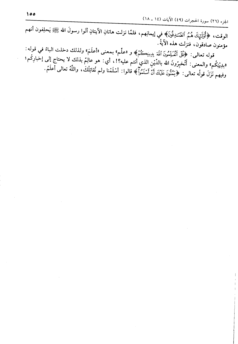 «بدينكم» والمعنى: أتُخبرون اللهَ بالدِّين الذي أنتم عليه؟!، أي: هو عالِمٌ بذلك لا يحتاج إِلى أخباركم وفيهم نزل قوله تعالى: يَمُنُّونَ عَلَيْكَ أَنْ أَسْلَمُوا قالوا: أَسْلَمْنا ولم نقاتلك، والله تعالى أعلم.