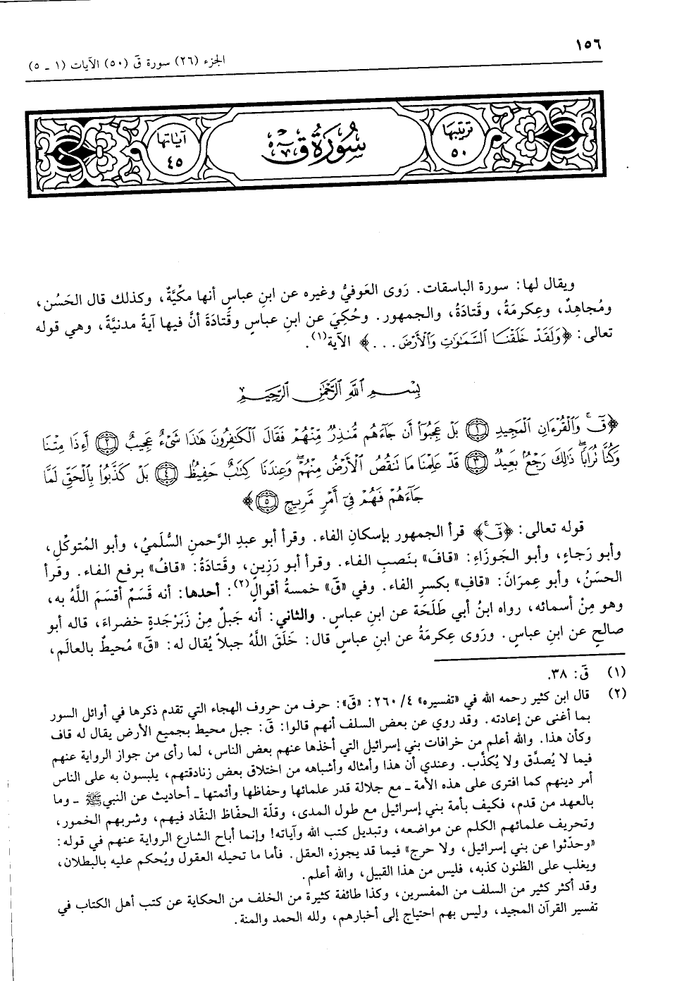 (2) قال ابن كثير رحمه الله في «تفسيره» 4/ 260: «ق» : حرف من حروف الهجاء التي تقدم ذكرها في أوائل السور بما أغنى عن إعادته. وقد روي عن بعض السلف أنهم قالوا: ق: جبل محيط بجميع الأرض يقال له قاف وكأن هذا. والله أعلم من خرافات بني إسرائيل التي أخذها عنهم بعض الناس، لما رأى من جواز الرواية عنهم فيما لا يصدّق ولا يكذّب. وعندي أن هذا وأمثاله وأشباهه من اختلاق بعض زنادقتهم، يلبسون به على الناس أمر دينهم كما افترى على هذه الأمة- مع جلالة قدر علمائها وحفاظها وأئمتها- أحاديث عن النبي صلّى الله عليه وسلم- وما بالعهد من قدم، فكيف بأمة بني إسرائيل مع طول المدى، وقلّة الحفّاظ النقّاد فيهم، وشربهم الخمور، وتحريف علمائهم الكلم عن مواضعه، وتبديل كتب الله وآياته! وإنما أباح الشارع الرواية عنهم في قوله: