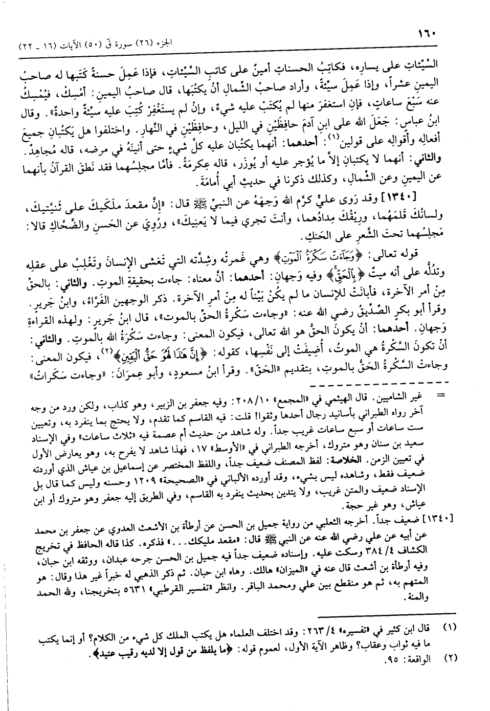 (1) قال ابن كثير في «تفسيره» 4/ 263: وقد اختلف العلماء هل يكتب الملك كل شيء من الكلام؟ أو إنما يكتب ما فيه ثواب وعقاب؟ وظاهر الآية الأول، لعموم قوله: ما يَلْفِظُ مِنْ قَوْلٍ إِلَّا لَدَيْهِ رَقِيبٌ عَتِيدٌ.