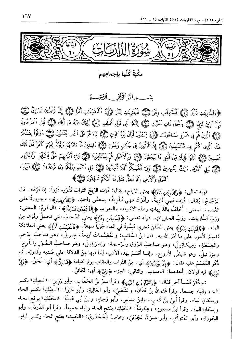 قوله تعالى: وَالذَّارِياتِ ذَرْواً يعني الرِّياح، يقال: ذَرَت الرِّيحُ الترابَ تَذْرُوه ذَرْواً: إذا فرَّقَتْه. قال الزجاج: يقال: ذَرَت فهي ذارية، وأذْرَت فهي مُذْرية، بمعنى واحد. وَالذَّارِياتِ، مجرورة على القَسَم، المعنى: أحْلفِ بالذّارياتِ وهذه الأشياء، والجواب إِنَّما تُوعَدُونَ لَصادِقٌ، قال قوم: المعنى: