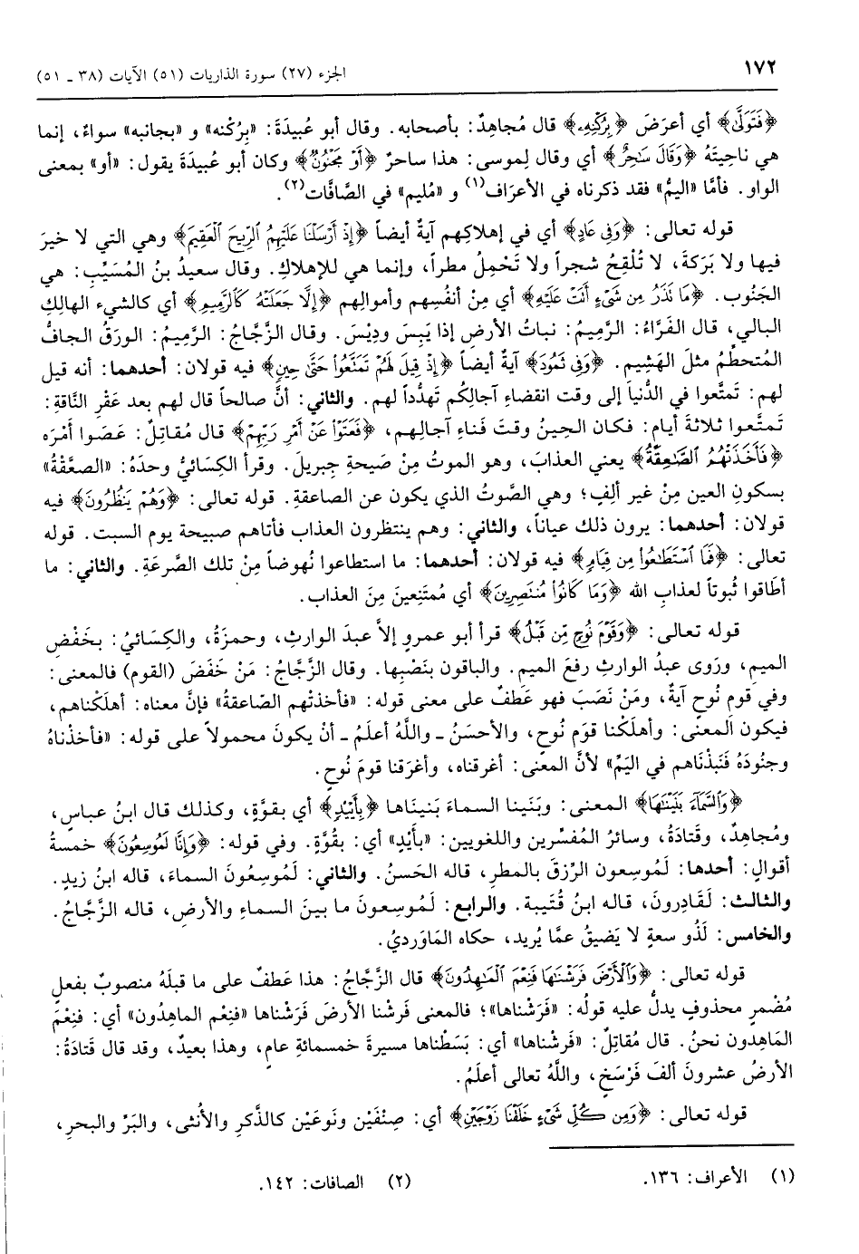وَالسَّماءَ بَنَيْناها المعنى: وبنينا السماء بنيناها بِأَيْدٍ أي بقْوَّة، وكذلك قال ابن عباس، ومجاهد، وقتادة، وسائر المفسرين واللغويين: «بأيد» اي: بقُوَّة. وفي قوله: وَإِنَّا لَمُوسِعُونَ خمسة أقوال: أحدها: لموسِعون الرِّزق بالمطر، قاله الحسن. والثاني: لموسِعون السماء، قاله ابن زيد.