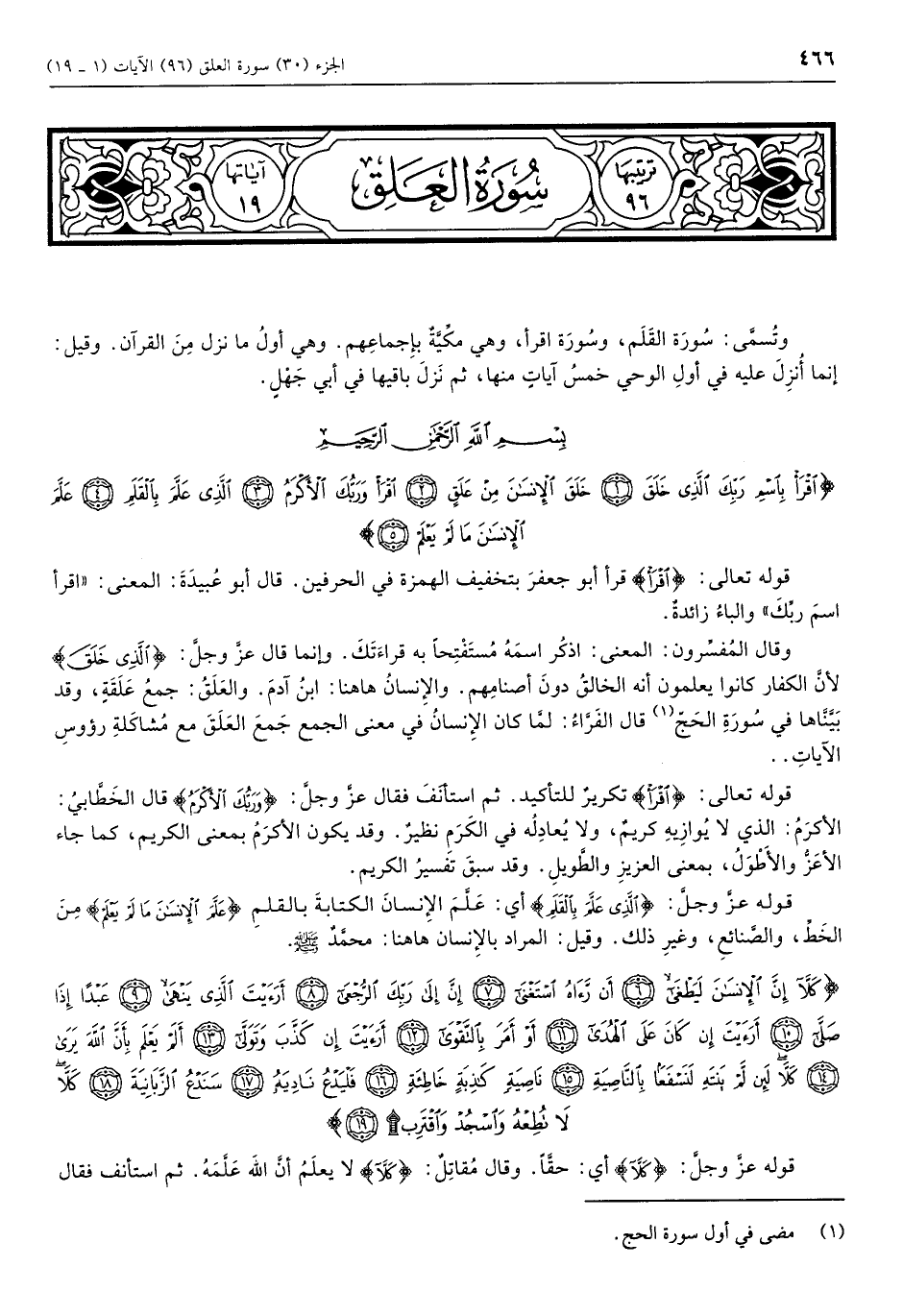 اقْرَأْ بِاسْمِ رَبِّكَ الَّذِي خَلَقَ (1) خَلَقَ الْإِنْسانَ مِنْ عَلَقٍ (2) اقْرَأْ وَرَبُّكَ الْأَكْرَمُ (3) الَّذِي عَلَّمَ بِالْقَلَمِ (4)