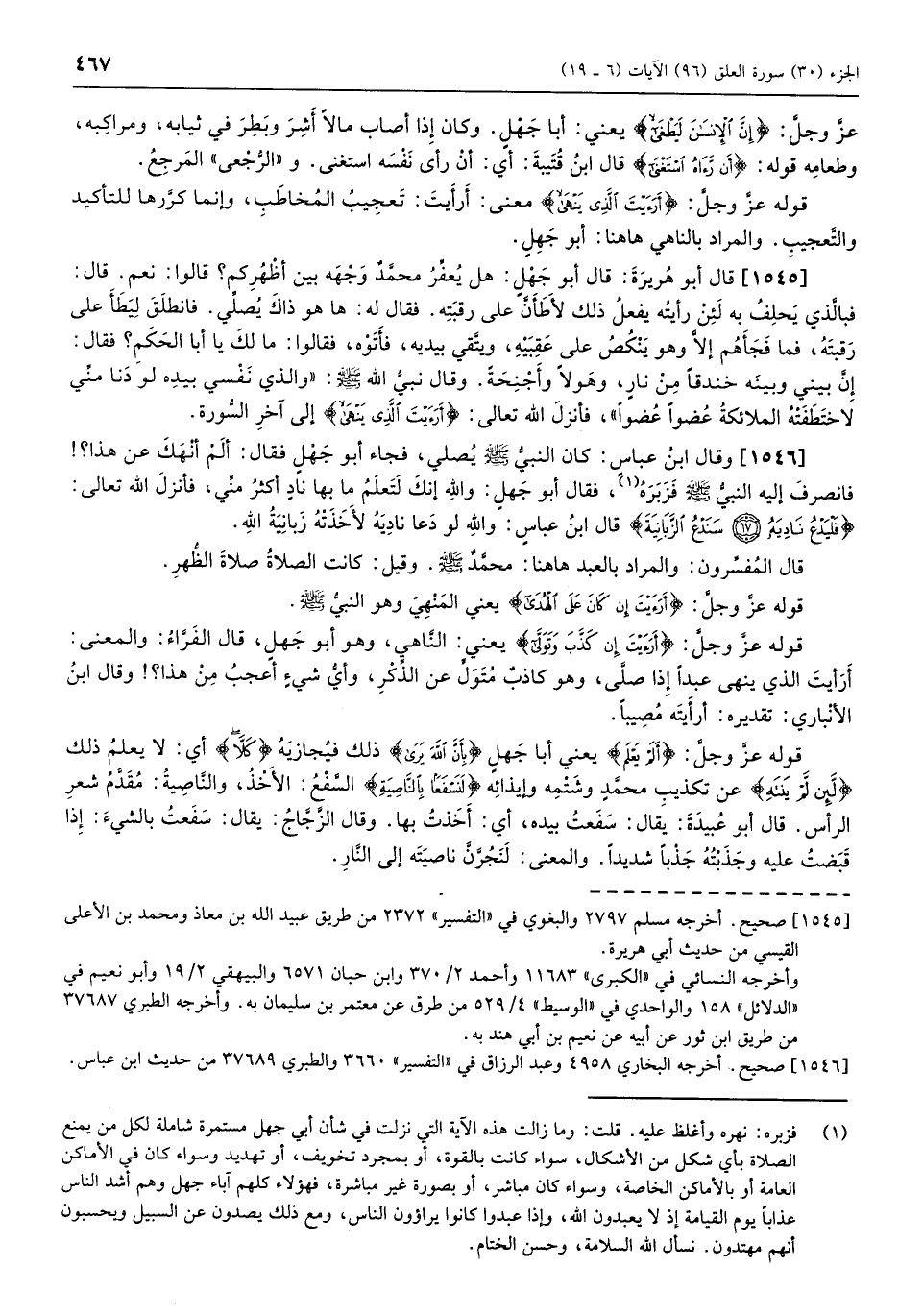 (1) فزبره: نهره وأغلظ عليه. قلت: وما زالت هذه الآية التي نزلت في شأن أبي جهل مستمرة شاملة لكل من يمنع الصلاة بأي شكل من الأشكال، سواء كانت بالقوة، أو بمجرد تخويف، أو تهديد وسواء كان في الأماكن العامة أو بالأماكن الخاصة، وسواء كان مباشر، أو بصورة غير مباشرة، فهؤلاء كلهم آباء جهل وهم أشد الناس عذابا يوم القيامة إذ لا يعبدون الله، وإذا عبدوا كانوا يراءون الناس، ومع ذلك يصدون عن السبيل ويحسبون أنهم مهتدون. نسأل الله السلامة، وحسن الختام.