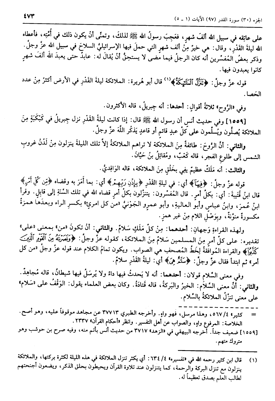 (1) قال ابن كثير رحمه الله في «تفسيره» 4/ 634: أي يكثر تنزل الملائكة في هذه الليلة لكثرة بركتها، والملائكة ينزلون مع تنزل البركة والرحمة، كما يتنزلون عند تلاوة القرآن ويحيطون بحلق الذكر، ويضعون أجنحتهم لطالب العلم بصدق تعظيما له.