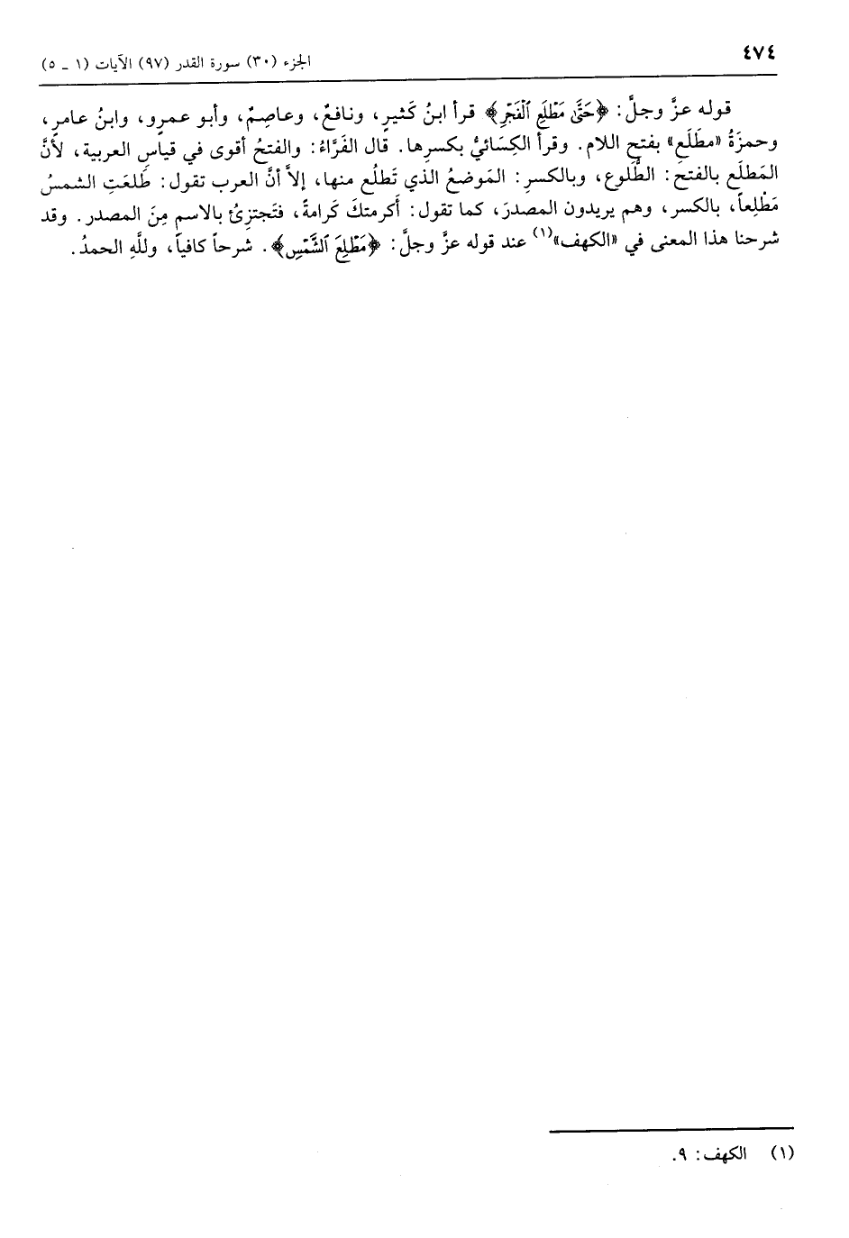 قوله عزّ وجلّ: حَتَّى مَطْلَعِ الْفَجْرِ قرأ ابن كثير، ونافع، وعاصم، وأبو عمرو، وابن عامر، وحمزة «مطلَع» بفتح اللام. وقرأ الكسائي بكسرها. قال الفراء: والفتح أقوى في قياس العربية، لأن المطلَع بالفتح: الطّلوع، وبالكسر: الموضع الذي تطلع منها، إلا أن العرب تقول: طلعت الشمس مطلِعاً، بالكسر، وهم يريدون المصدر، كما تقول: أكرمتك كرامة، فتجتزئ بالاسم من المصدر. وقد شرحنا هذا المعنى في «الكهف» «1» عند قوله عزّ وجلّ: مَطْلِعَ الشَّمْسِ. شرحا كافيا، ولله الحمد.