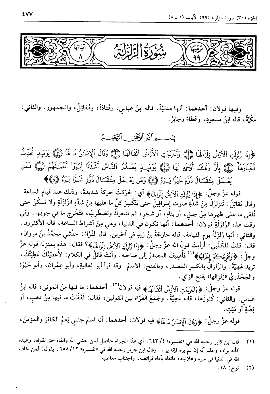 إِذا زُلْزِلَتِ الْأَرْضُ زِلْزالَها (1) وَأَخْرَجَتِ الْأَرْضُ أَثْقالَها (2) وَقالَ الْإِنْسانُ ما لَها (3) يَوْمَئِذٍ تُحَدِّثُ أَخْبارَها (4)