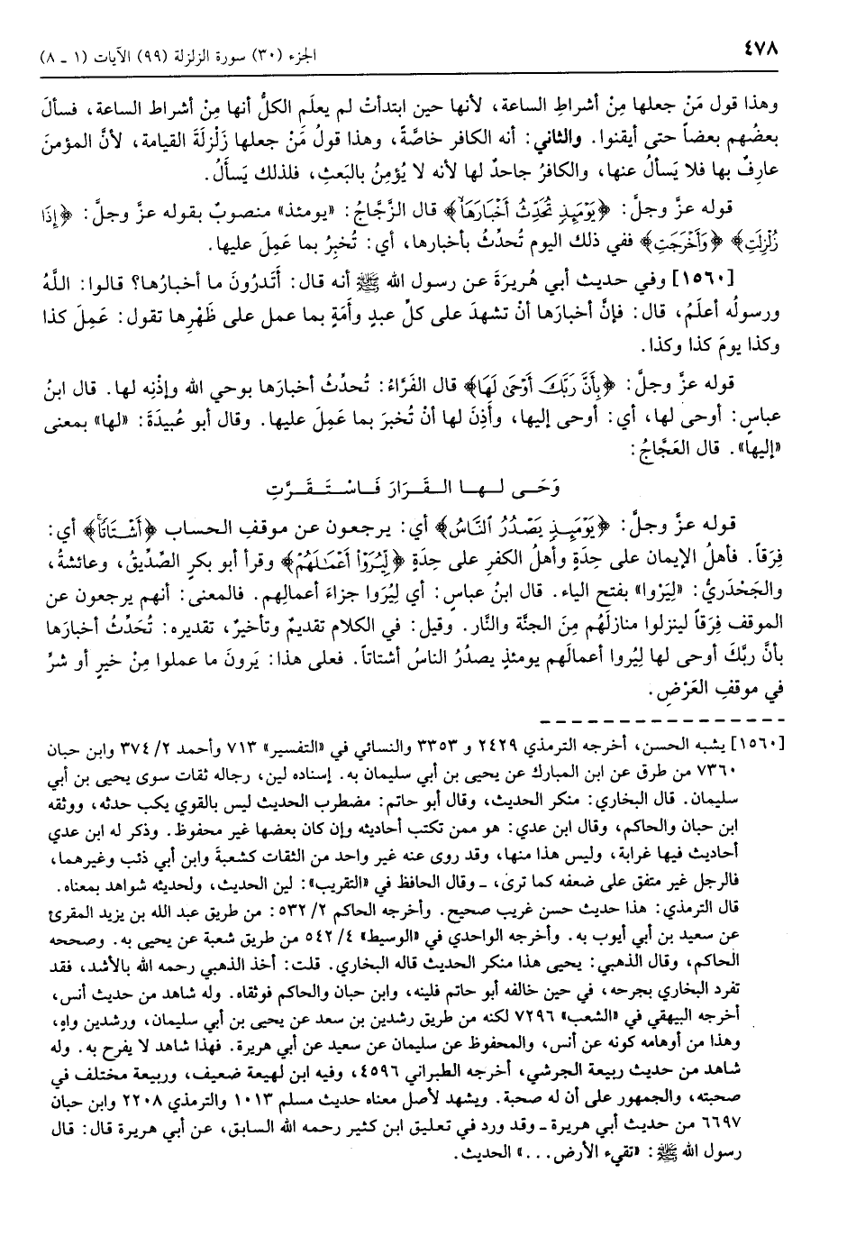 (1560) وفي حديث أبي هريرة عن رسول الله صلّى الله عليه وسلم أنه قال: أتدرون ما أخبارها؟ قالوا: الله ورسوله أعلم، قال: فإنّ أخبارها أن تشهد على كل عبد وأمة بما عمل على ظهرها تقول: عمل كذا وكذا يوم كذا وكذا.