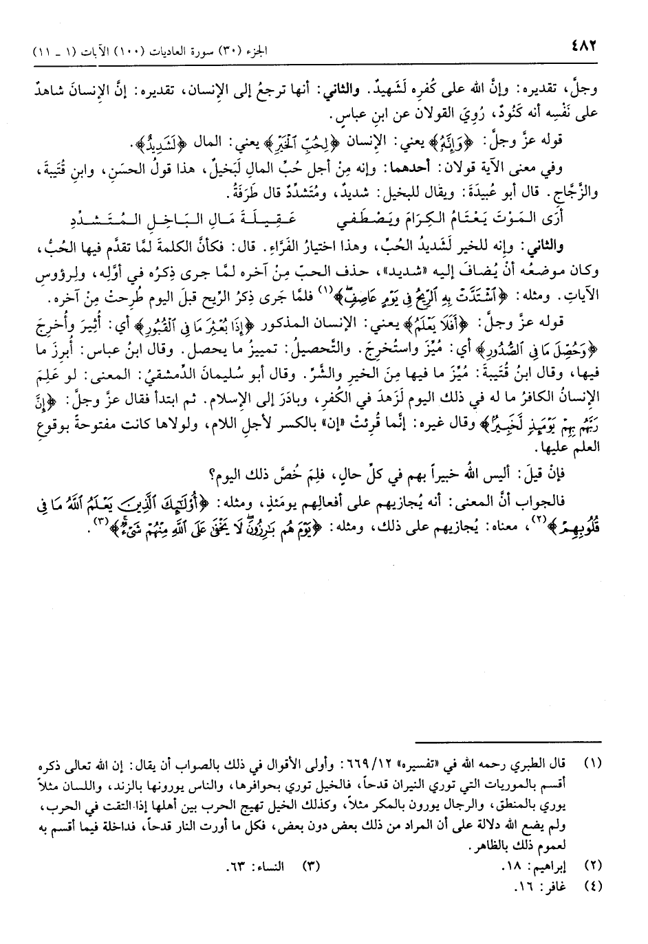 والثاني: وإنه للخير لشديد الحبِّ، وهذا اختيار الفراء. قال: فكأن الكلمة لمَّا تقدم فيها الحب، وكان موضعه أن يضاف إليه «شديد» ، حذف الحبّ من آخره لما جرى ذكره في أوّله، ولرؤوس الآيات. ومثله: اشْتَدَّتْ بِهِ الرِّيحُ فِي يَوْمٍ عاصِفٍ «2» فلما جرى ذكر الريح قبل اليوم طرحت من آخره.