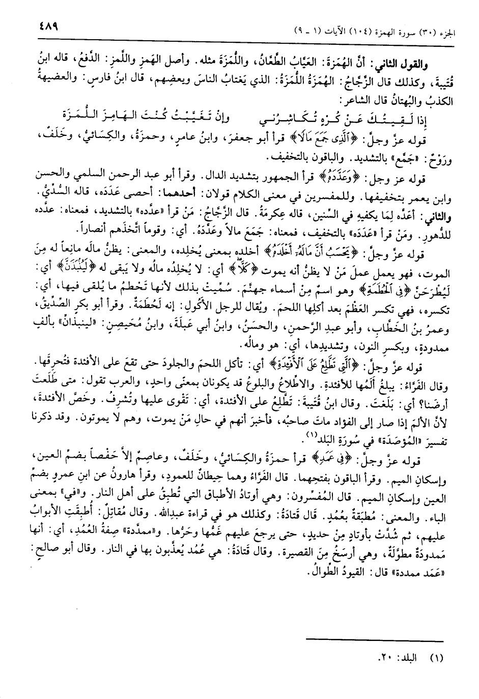 قوله عزّ وجلّ: فِي عَمَدٍ قرأ حمزة والكسائيّ، وخلف، وعاصم إلا حفصاً بضم العين، وإسكان الميم. وقرأ الباقون بفتحهما. قال الفرّاء وهما حيطان للعمود، وقرأ هارون عن ابن عمرو بضم العين وإسكان الميم. قال المفسرون: وهي أوتاد الأطباق التي تطبق على أهل النار. و «في» بمعنى الباء. والمعنى: مطبَقة بعُمُدٍ. قال قتادة: وكذلك هو في قراءة عبد الله. وقال مقاتل: أُطبقت الأبواب عليهم، ثم شُدَّت بأوتادٍ من حديد، حتى يرجع عليهم غَمُّها وحَرُّها. و «ممدَّدة» صفة العُمُد، أي: أنها ممدودة مطوّلة، وهي أرسخ من القصيرة. وقال قتادة: هي عُمُدٌ يعذَّبون بها في النار. وقال أبو صالح: