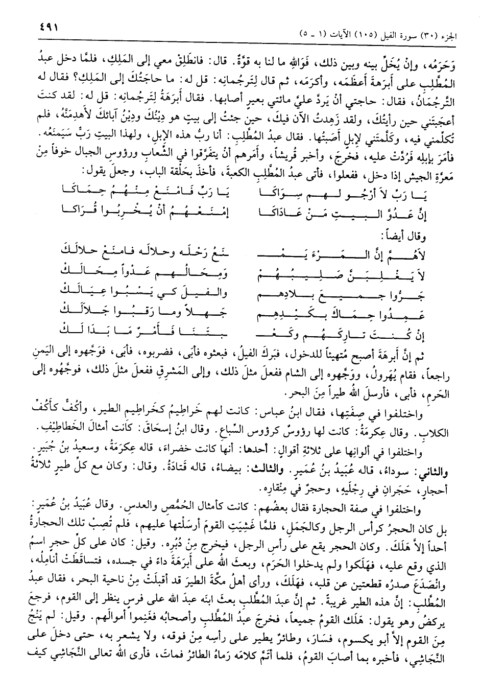 بل كان الحجر كرأس الرجل وكالجمل، فلما غشيت القوم أرسلتها عليهم، فلم تصب تلك الحجارة أحداً إلا هلك. وكان الحجر يقع على رأس الرجل، فيخرج من دبره. وقيل: كان على كل حجر اسم الذي وقع عليه، فهلكوا ولم يدخلوا الحرم، وبعث الله على أبرهة داء في جسده، فتساقطت أنامله، وانصدع صدره قطعتين عن قلبه، فهلك، ورأى أهل مكّة الطير قد أقبلت من ناحية البحر، فقال عبد المطلب: إن هذه الطير غريبة. ثم إن عبد المطلب بعث ابنه عبد الله على فرس ينظر إلى القوم، فرجع يركض وهو يقول: هلك القوم جميعاً، فخرج عبد المطلب وأصحابه فغنموا أموالهم. وقيل: لم ينج من القوم إلّا أبو يكسوم، فسار، وطائر يطير على رأسه من فوقه، ولا يشعر به، حتى دخل على النجاشي، فأخبره بما أصاب القوم، فلما أتم كلامه رماه الطائر فمات، فأرى الله تعالى النجاشي كيف