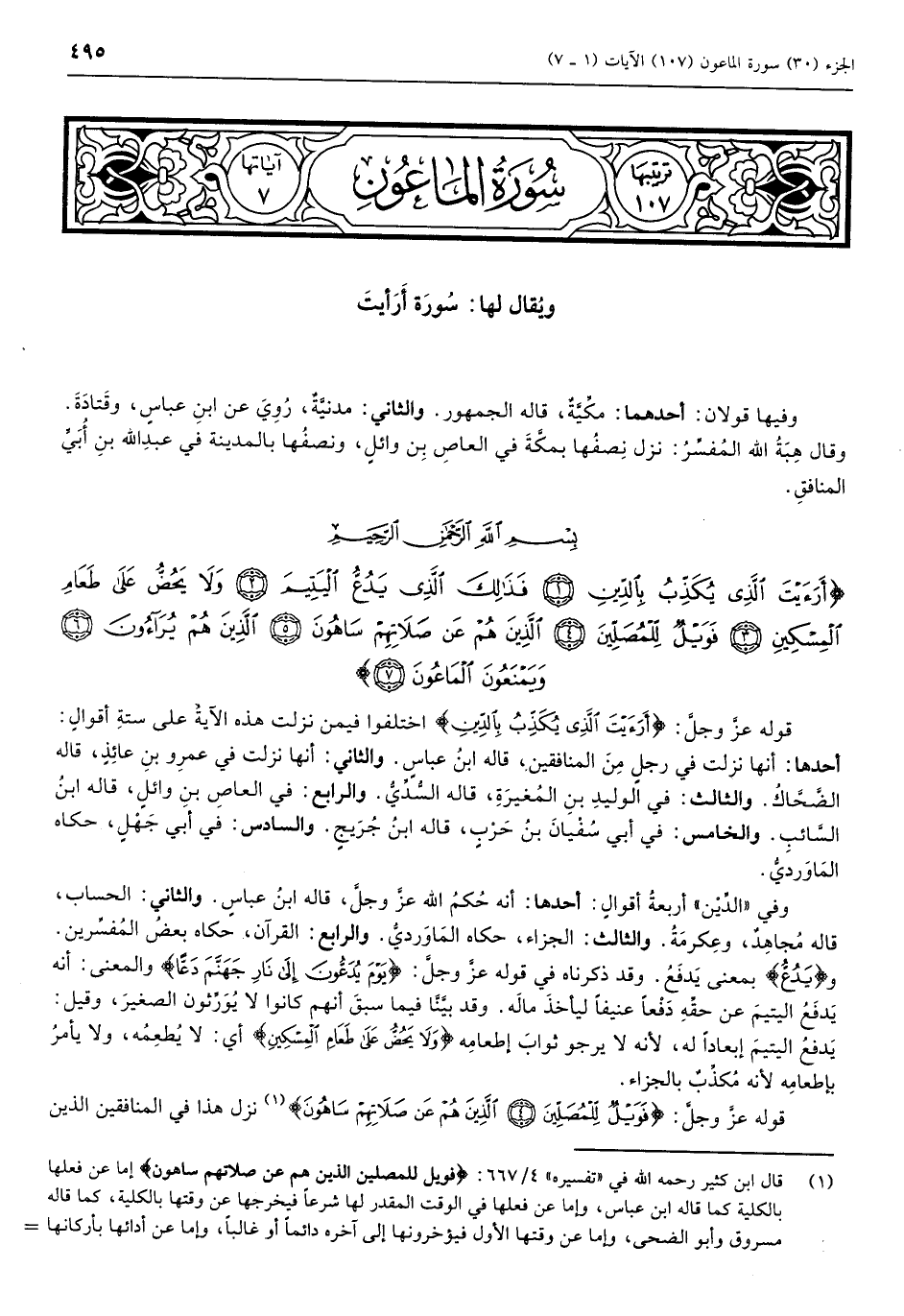 (1) قال ابن كثير رحمه الله في «تفسيره» 4/ 667: فَوَيْلٌ لِلْمُصَلِّينَ الَّذِينَ هُمْ عَنْ صَلاتِهِمْ ساهُونَ إما عن فعلها بالكلية كما قاله ابن عباس، وإما عن فعلها في الوقت المقدر لها شرعا فيخرجها عن وقتها بالكلية، كما قاله مسروق وأبو الضحى، وإما عن وقتها الأول فيؤخرونها إلى آخره دائما أو غالبا، وإما عن أدائها بأركانها وشروطها على الوجه المأمور به، وإما عن الخشوع فيها والتدبر لمعانيها فاللفظ يشمل ذلك كله، ولكل من اتصف بشيء من ذلك قسط من هذه الآية.