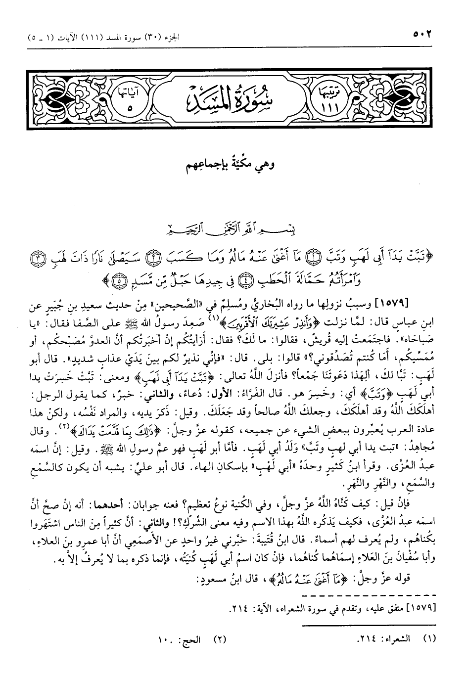 (1579) وسبب نزولها ما رواه البخاري ومسلم في «الصحيحين» من حديث سعيد بن جبير عن ابن عباس قال: لما نزلت وَأَنْذِرْ عَشِيرَتَكَ الْأَقْرَبِينَ «1» صعد رسول الله صلّى الله عليه وسلم على الصفا فقال: «يا صباحاه» . فاجتمعت إليه قريش، فقالوا: ما لك؟ فقال: أرأيتُكم إن أخبرتُكم أن العدوَّ مصبِّحكم، أو ممسِّيكم، أما كنتم تصدقوني؟» قالوا: بلى. قال: «فإني نذير لكم بين يدي عذاب شديد» . قال أبو لهب: تَباً لك، ألهذا دعوتنا جمعا؟ فأنزل الله تعالى: تَبَّتْ يَدا أَبِي لَهَبٍ ومعنى: تبت خسرت يدا أبي لهب وَتَبَّ أي: وخسر هو. قال الفراء: الأول: دعاء، والثاني: خبر، كما يقول الرجل: