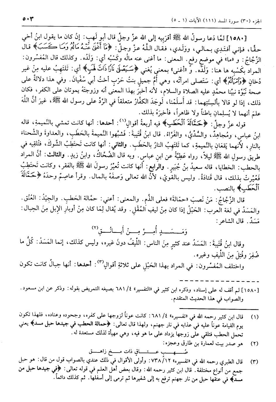 (3) قال الطبري رحمه الله في «تفسيره» 12/ 738: وأولى الأقوال في ذلك عندي بالصواب قول من قال: هو حبل جمع من أنواع مختلفة. قال ابن كثير رحمه الله: وقال بعض أهل العلم في قوله تعالى: فِي جِيدِها حَبْلٌ مِنْ مَسَدٍ في عنقها حبل من نار جهنم ترفع به إلى شفيرها ثم ترمى إلى أسفلها. ثم كذلك دائما.
