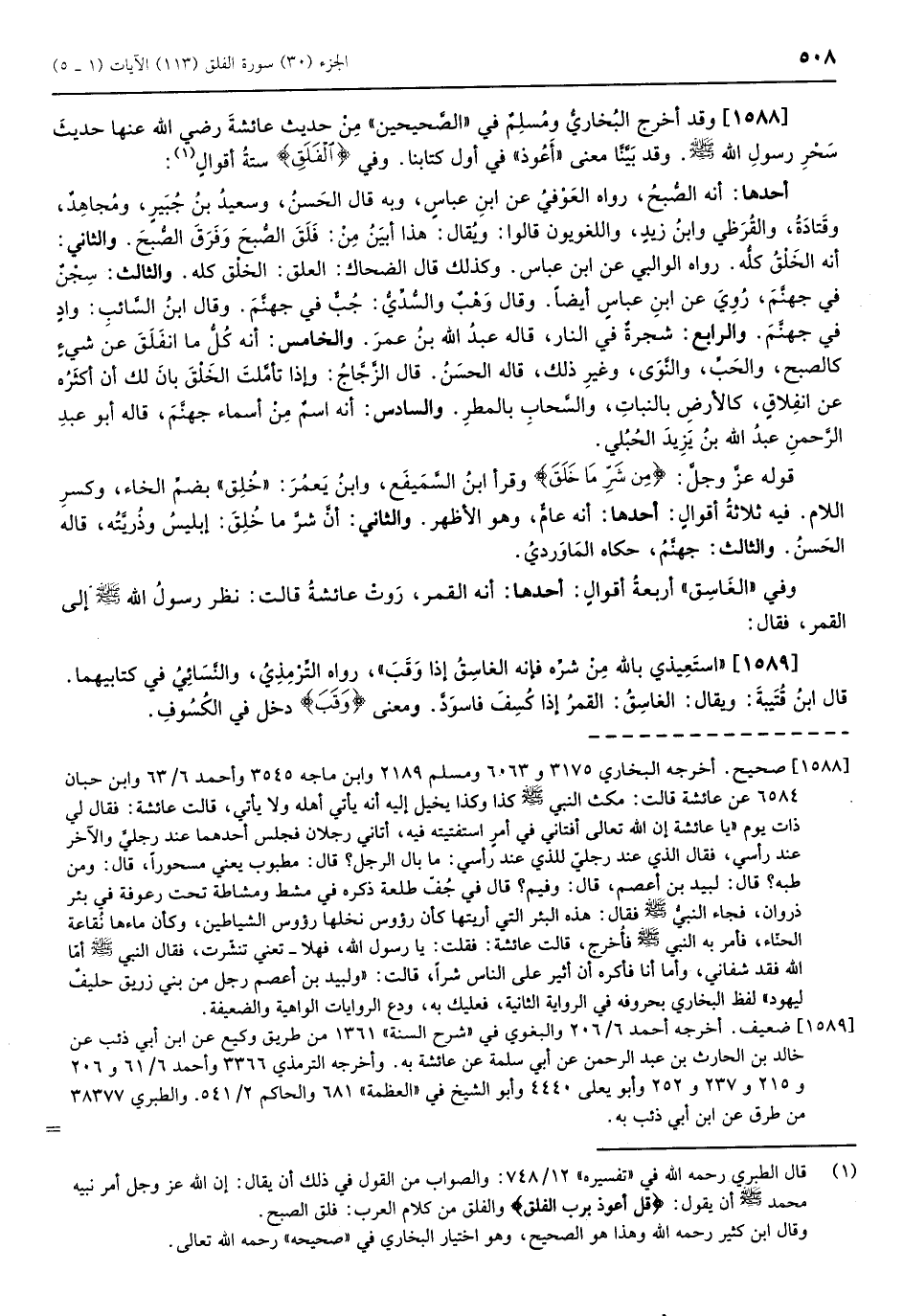 (1588) وقد أخرج البخاري ومسلم في «الصحيحين» من حديث عائشة رضي الله عنها حديث سحر رسول الله صلّى الله عليه وسلم. وقد بينا معنى «أعوذ» في أول كتابنا. وفي الْفَلَقِ ستة أقوال «1» :