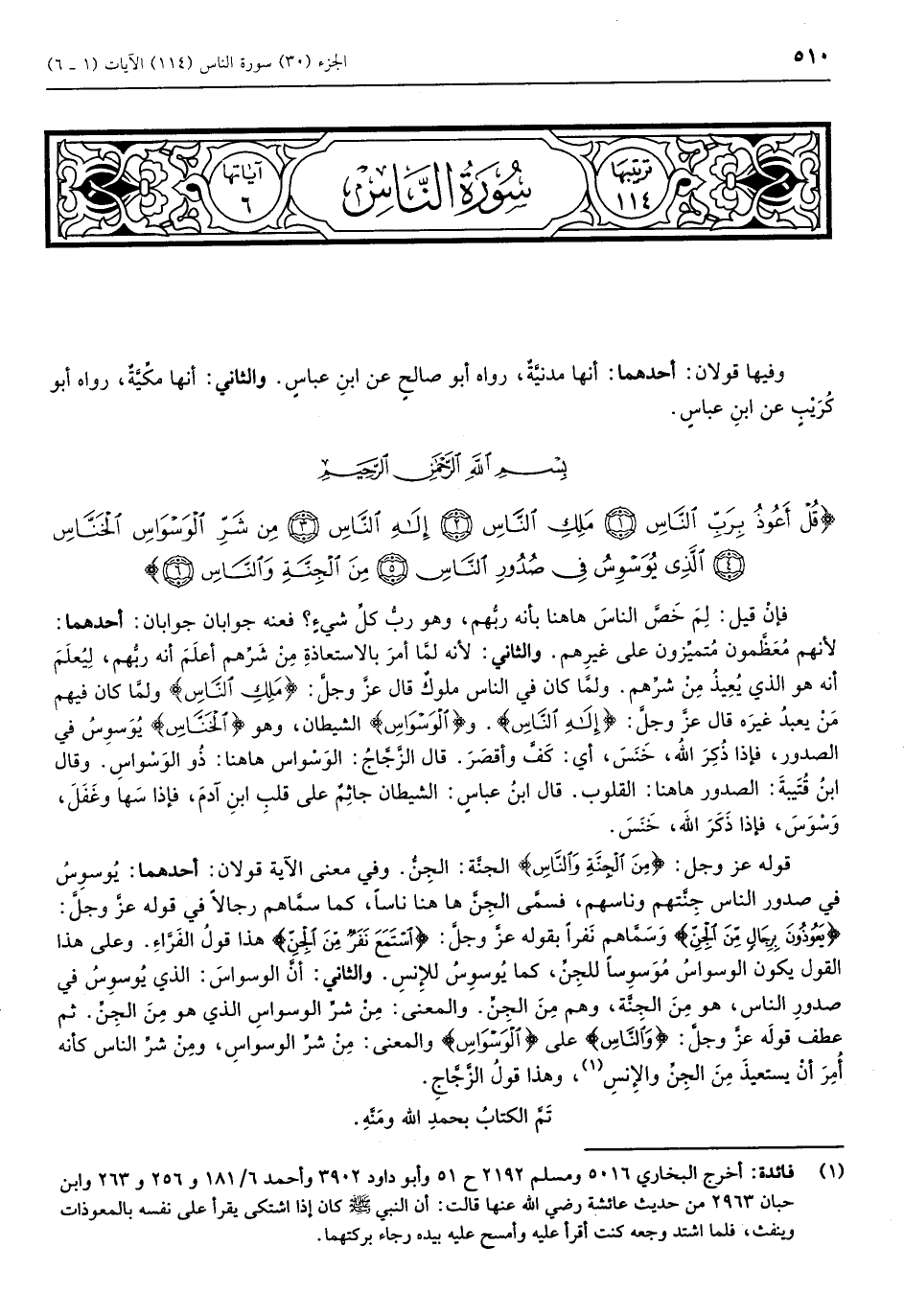 قُلْ أَعُوذُ بِرَبِّ النَّاسِ (1) مَلِكِ النَّاسِ (2) إِلهِ النَّاسِ (3) مِنْ شَرِّ الْوَسْواسِ الْخَنَّاسِ (4)
