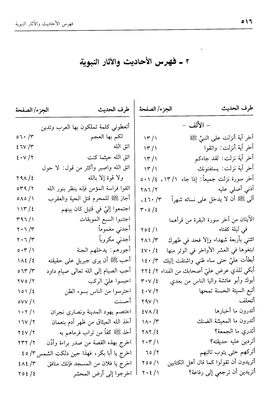 2- فهرس الأحاديث والآثار النبوية طرف الحديث الجزء/ الصفحة- الألف- آخر آية أنزلت على النبيّ صلّى الله عليه وسلم 1/ 13 آخر آية أنزلت: واتقوا 1/ 13 آخر آية نزلت: لقد جاءكم 1/ 13 آخر آية نزلت: يستفتونك 1/ 13 آخر سورة نزلت جميعا: إذا جاء 1/ 13، 4/ 501 آذني أصلي عليه 2/ 286 آلى صلّى الله عليه وسلم أن لا يدخل على نسائه شهرا 3/ 460، 4/ 305 الآيتان من آخر سورة البقرة من قرأهما في ليلة كفتاه 1/ 254 ائتني بأربعة شهداء وإِلا فحدٌّ في ظهرك 3/ 281 ابتغوها في العشر الأواخر في الوتر منها 4/ 470 أبطأتَ عليَّ حتى ساء ظني واشتقتُ إِليك 3/ 140 أبكي للذي عرض عليَّ أصحابُك من الفداء 2/ 224 أبوك وأبو عائشة والِيا الناس من بعدي 4/ 307 أتبع السيئة الحسنة تمحها 2/ 407 أتحلف 1/ 297 أتدرون ما أخبارها 4/ 478 أتدرون ما المعيشة الضنك 3/ 180 أتدري ما الجمعة؟ 4/ 282 أتردين عليه حديقته؟ 1/ 203 أتركهم حتى يتوب تائبهم 2/ 65 أتريدون أن تقولوا كما قال أهل الكتابين 1/ 255 أتريدين أن ترجعي إلى رفاعة؟ 1/ 204 طرف الحديث الجزء/ الصفحة أتُعطوني كلمة تملكون بها العرب وتدين لكم بها العجم 3/ 560 اتق الله 3/ 467 اتق الله حيثما كنت 2/ 407 اتق الله واصبر وأكثر من قول: لا حول ولا قوة إلا بالله 4/ 298 اتقوا فِراسة المؤمن فإنه ينظر بنور الله 2/ 539 أجاز صلّى الله عليه وسلم للمحرم قتل الحية والعقرب 1/ 585 اجتمعوا إليّ في قتيل كان بينهم 4/ 113 اجتنبوا السبع الموبقات 1/ 396 أجدني مغموما 3/ 206 أجدني مكروبا 3/ 206 أجورهم: يدخلهم الجنة 1/ 503 أحب صلّى الله عليه وسلم أن يرى جبريل على حقيقته 4/ 184 أحب الصيام إلى الله تعالى صيام داود 3/ 563 احبسوا عليّ الركب 2/ 275 احترسوا من الناس بسوء الظن 4/ 151 أحسنت 1/ 577 اختصم يهود المدينة ونصارى نجران 1/ 102 أخذ الله الميثاق من ظهر آدم بنعمان 2/ 167 أخذ صلّى الله عليه وسلم كفا من تراب فرماهم به 2/ 247 اخرج بهذه القصة من صدر براءة وأذِّن 2/ 232 اخرج يا أبا بكر، فهذا حين دلكت الشمس 3/ 45 اخرج يا فلان من المسجد فانك منافق 3/ 484 اخرجوا إلى أرض المحشر 4/ 254