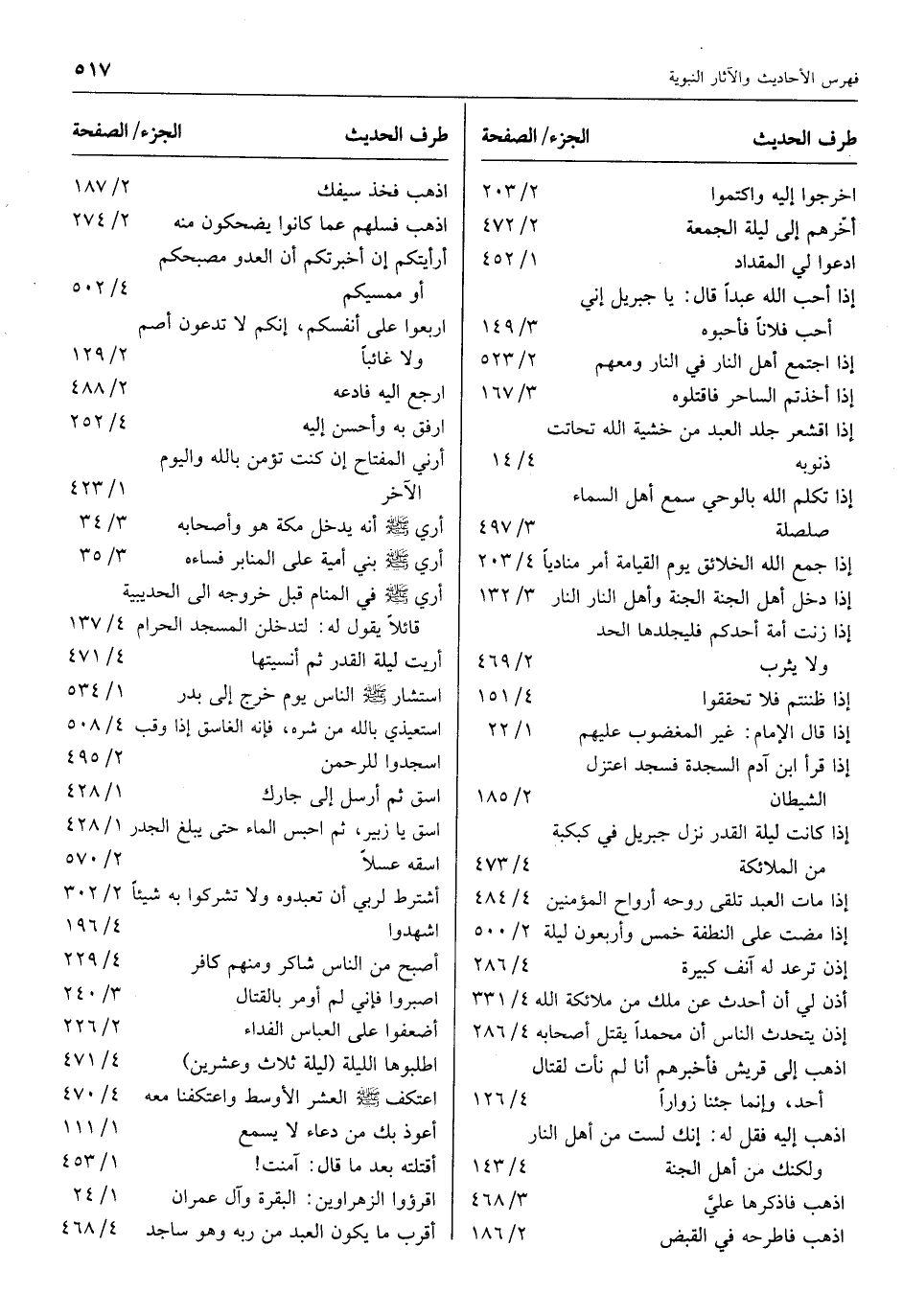 طرف الحديث الجزء/ الصفحة اخرجوا إليه واكتموا 2/ 203 أخّرهم إلى ليلة الجمعة 2/ 472 ادعوا لي المقداد 1/ 472 ادعوا لي المقداد 1/ 452 إِذا أحب الله عبداً قال: يا جبريل إني أحب فلانا فأحبوه 3/ 149 إِذا اجتمع أهل النار في النار ومعهم 2/ 523 إذا أخذتم الساحر فاقتلوه 3/ 167 إِذا اقشعرَّ جِلْد العَبْد من خَشْية الله تحاتت ذنوبه 4/ 14 إِذا تكلَّم اللهُ بالوحي سمع أهلُ السماء صلصلة 3/ 497 إذا جَمَع اللهُ الخلائق يوم القيامة أمر مناديا 4/ 203 إِذا دخل أهل الجنة الجنة وأهل النار النار 3/ 132 إِذا زنت أمة أحدكم فليجلدها الحدَّ ولا يثرب 2/ 469 إذا ظننتم فلا تحققوا 4/ 151 إذا قال الإمام: غير المغضوب عليهم 1/ 22 إذا قرأ ابن آدم السجدة فسجد اعتزل الشيطان 2/ 185 إذا كانت ليلة القدر نزل جبريل في كبكبة من الملائكة 4/ 473 إذا مات العبد تلقى رُوحُه أرواحَ المؤمنين 4/ 484 إِذا مضت على النطفة خمس وأربعون ليلة 2/ 500 إذن ترعد له آنف كبيرة 4/ 286 أُذِنَ لي أن أُحَدِّثَ عن مَلَك من ملائكة الله 4/ 331 إذن يتحدث الناس أن محمدا يقتل أصحابه 4/ 286 اذْهَبْ إِلى قريش فأَخْبِرْهم أنّا لَمْ نأتِ لقتال أحد، وإنما جئنا زوارا 4/ 126 اذهب إليه فقل له: إنك لست من أهل النار ولكنك من أهل الجنة 4/ 143 اذهب