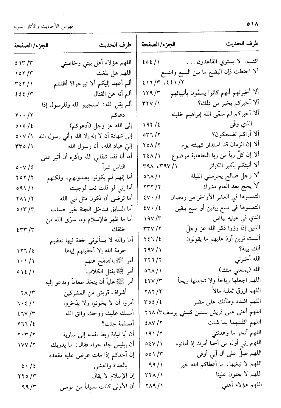 اكتب: لا يستوي القاعدون 1/ 454 ألا احتطتَ فانَّ البِضْع ما بين السبع والتسع 2/ 441، 3/ 416 ألا أخبرتهم أنهم كانوا يسمّون بأنبيائهم 3/ 129 ألا أخبركم بخير من ذلك؟ 1/ 327 ألا أُخْبِرُكم لِمَ سمَّى اللهُ إِبراهيمَ خليله الذي وفّى 4/ 192 ألا أراكم تضحكون؟ 2/ 536 ألا إن الزمان قد استدار كهيئته يوم 2/ 258 أَلا إِن كل رباً من ربا الجاهلية موضوع 1/ 248 ألا أنبئكم بأكبر الكبائر 1/ 397، 398 ألا رجل صالح يحرسني الليلة 1/ 568 ألّا يحج بعد العام مشرك 2/ 232 التمسوها في العشر الأواخر من رمضان 4/ 470 التمسوها في تسع يبقين أو سبع يبقين 4/ 470 الذي في عينيه بياض 3/ 197 الذين إذا رأوا ذكر الله عز وجلّ 2/ 337 ألست ترين أردّ عليهم ما يقولون 4/ 246 ألك بينة؟ 1/ 297 الله أخبرني 2/ 226 الله (يمنعني منك) 1/ 568 اللهم اجعلها رياحا ولا تجعلها ريحا 3/ 427 اللهم ارزق ثعلبة مالا 2/ 282 اللهم اشدد وطأتك على مضر 4/ 354 اللهم أَعِنِّي على قريش بسنين كَسِنِيِّ يوسف 3/ 268 اللهم اكفنيهما بما شئت 2/ 487 اللهم أنجز ما وعدتني 2/ 191 اللهم إني أول من أحيا أمرك إذ أماتوه 1/ 547 اللهم صلّ على آل أبي أوفى 3/ 551 اللهم لا نبغيها، ما أعطاكم الله خير 1/ 99 اللهم لا يعلون علينا 1/ 328 اللهم هؤلاء أهلي 1/ 289 اللهم هؤلاء أهل بيتي وخاصتي 3/ 463 اللهم هل بلغت 3/ 152 ألم أعهد إليكم ألا تبرحوا؟ أظننتم 1/ 342 ألم أنه عن القتال 3/ 444 ألم يقل الله: استجيبوا لله وللرسول إذا دعاكم 2/ 200 إلى الله عز وجل (أدعكم) 4/ 505 إِلى شهادة أن لا إِله إِلا الله وأنِّي رسولُ الله 1/ 507 إليّ عباد الله، أنا رسول الله 1/ 335 أما أنا فقد شفاني الله وأكره أن أثير على الناس شرا 4/ 507 أما إنهم لم يكونوا يعبدونهم، ولكنهم 2/ 252 أما إني لو قلت نعم لوجبت 1/ 591 أما ترضى أن تكون مثل نبي الله 2/ 281 أما السابق فيدخل الجنة بغير حساب 3/ 513 أمَّا ما ظهر فالإِسلام وما سوَّى اللهُ من خلقك 3/ 433 أما واللهِ لا يسألوني خُطَّةً فيها تعظيمُ حرمة الله إلا أعطيتهم إياها 4/ 126 أمر صلّى الله عليه وسلم بالصفح عنهم 1/ 101 أمر صلّى الله عليه وسلم بقتل الكلاب 1/ 514 أمر صلّى الله عليه وسلم عليا أن يتخذ طعاماً ويدعو إِليه أشراف قريش من المشركين 3/ 28 أمروا أن لا يخونوا ولا يدّخروا 1/ 604 أمسك عليك زوجك واتق الله 3/ 467 أمسلمة جئت؟ 4/ 266 أن أبا لبابة ربط نفسه إلى سارية 2/ 203 أن إبليس جاء حواء فقال: ما يدريك 2/ 177 إنَّ أحدكم إذا مات عُرِضَ عليه مَقْعَدُه بالغداة والعشي 4/ 40 إن الإسلام لا يقال 3/ 225 أن الأولى كانت نسيانا من موسى 3/ 99