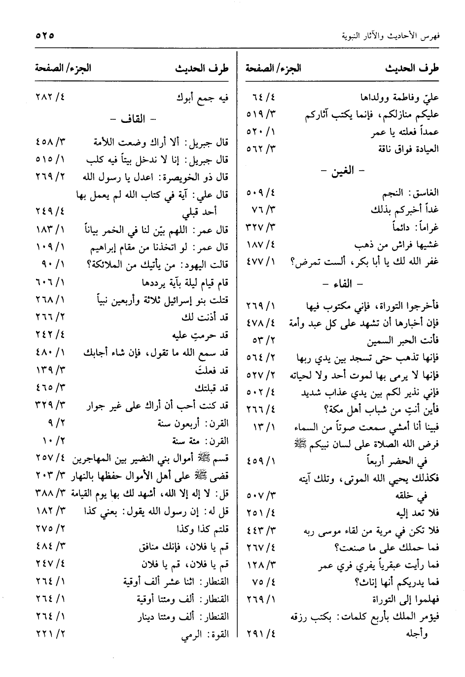 طرف الحديث الجزء/ الصفحة عليّ وفاطمة وولداها 4/ 64 عليكم منازلكم، فإنما يكتب آثاركم 3/ 519 عمدا فعلته يا عمر 1/ 520 العيادة فواق ناقة 3/ 562- الغين- الغاسق: النجم 4/ 509 غدا أخبركم بذلك 3/ 76 غراما: دائما 3/ 327 غشيها فراش من ذهب 4/ 187 غفر الله لك يا أبا بكر، ألست تمرض؟ 1/ 477- الفاء- فأخرجوا التوراة، فإني مكتوب فيها 1/ 269 فإن أخبارها أن تشهد على كل عبد وأمة 4/ 478 فأنت الحبر السمين 2/ 53 فإنها تذهب حتى تسجد بين يدي ربّها 2/ 564 فإنها لا يُرمى بها لموت أحد ولا لحياته 2/ 527 فإني نذير لكم بين يدي عذاب شديد 4/ 502 فأين أنت من شباب أهل مكة؟ 4/ 266 فبينا أنا أمشي سمعت صوتا من السماء 1/ 13 فرض الله الصلاة على لسان نبيكم صلّى الله عليه وسلم في الحضر أربعا 1/ 459 فكذلك يُحيي اللهُ الموتى، وتلك آيتُه في خلقه 3/ 507 فلا تعد إليه 4/ 251 فلا تكن في مرية من لقاء موسى ربه 3/ 443 فما حملك على ما صنعت؟ 4/ 267 فما رأيت عبقريا يفري فري عمر 3/ 128 فما يدريكم أنها إناث؟ 4/ 75 فهلموا إلى التوراة 1/ 269 فيؤمر الملك بأربع كلمات: بكتبِ رزقِهِ وأجلِهِ 4/ 291 فيه جمع أبوك 4/ 282- القاف- قال جبريل: ألا أراك وضعت اللأمة 3/ 458 قال جبريل: إنا لا ندخل بيتا فيه كلب 1/ 515 قال ذو الخويصرة: اعدل يا رسول الله 2/ 269 قال علي: آية في كتاب الله لم يعمل بها أحد قبلي 4/ 249 قال عمر: اللهم بيّن لنا في الخمر بيانا 1/ 183 قال عمر: لو اتخذنا من مقام إبراهيم 1/ 109 قالت اليهود: من يأتيك من الملائكة؟ 1/ 90 قام قيام ليلة بآية يرددها 1/ 606 قتلت بنو إسرائيل ثلاثة وأربعين نبيا 1/ 268 قد أذنت لك 2/ 266 قد حرمت عليه 4/ 242 قد سمع الله ما تقول، فإن شاء أجابك 1/ 480 قد فعلت 3/ 139 قد قبلتك 3/ 465 قد كنت أُحِبُّ أن أراك على غير جوار 3/ 329 القرن: أربعون سنة 2/ 9 القرن: مائة سنة 2/ 10 قسم صلّى الله عليه وسلم أموال بني النضير بين المهاجرين 4/ 257 قضى صلّى الله عليه وسلم على أهل الأموال حفظها بالنهار 3/ 203 قل: لا إِله إِلا الله، أشهد لك بها يوم القيامة 3/ 388 قل له: إِن رسول الله يقول: بعني كذا 3/ 182 قلتم كذا وكذا 2/ 275 قم يا فلان، فإنك منافق 3/ 484 قم يا فلان، قم يا فلان 4/ 247 القنطار: اثنا عشر ألف أوقية 1/ 264 القنطار: ألف ومائتا أوقية 1/ 264 القنطار: ألف ومائتا دينار 1/ 264 القوة: الرمي 2/ 221