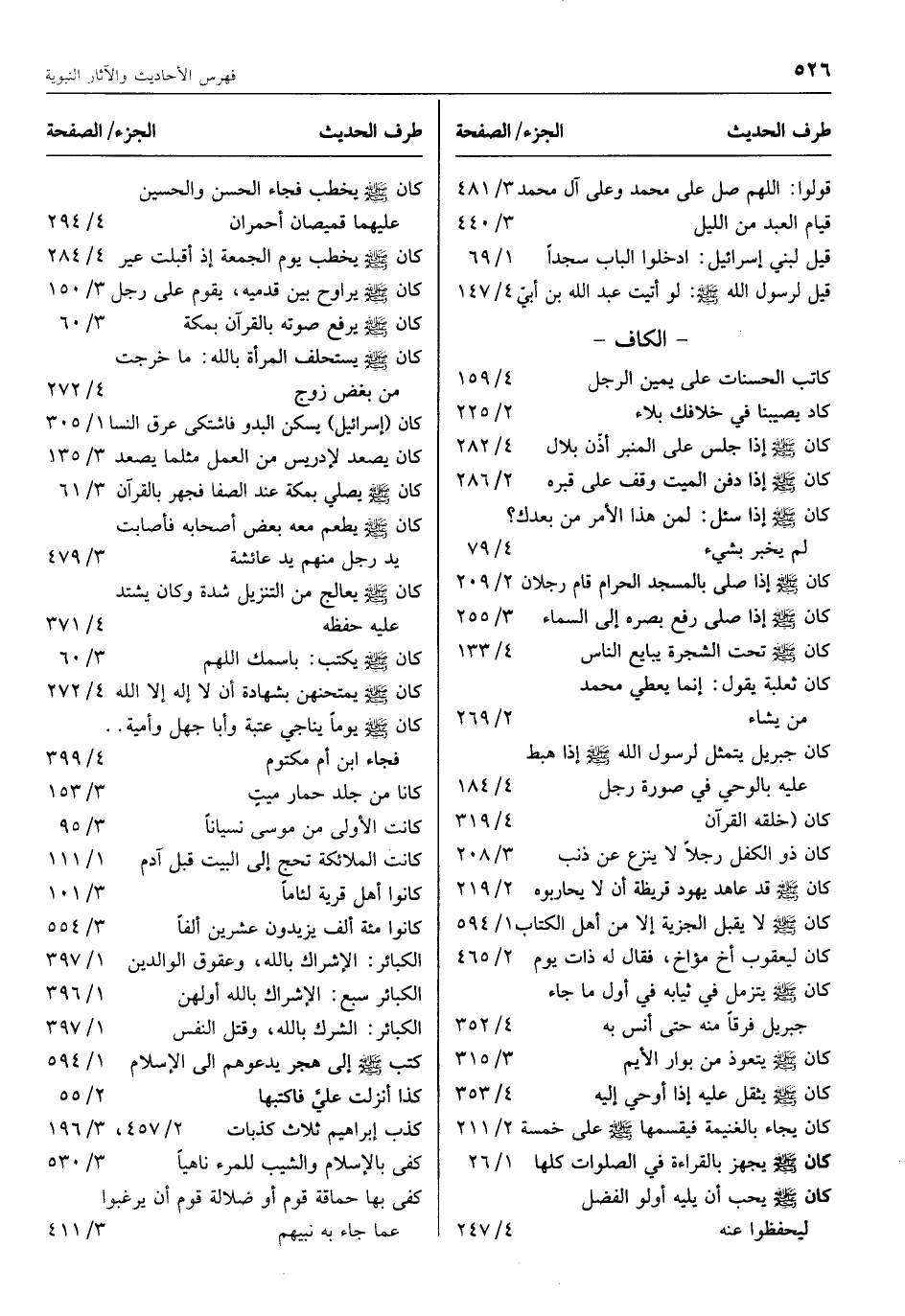 طرف الحديث الجزء/ الصفحة قولوا: اللهم صلِّ على محمد وعلى آل محمد 3/ 481 قيام العبد من الليل 3/ 440 قيل لبني إسرائيل: ادخلوا الباب سجدا 1/ 69 قيل لرسول الله صلّى الله عليه وسلم: لو أتيت عبد الله بن أبيّ 4/ 147- الكاف- كاتب الحسنات على يمين الرجل 4/ 159 كاد يصيبنا في خلافك بلاء 2/ 225 كان صلّى الله عليه وسلم إذا جلس على المنبر أذّن بلال 4/ 282 كان صلّى الله عليه وسلم إذا دفن الميت وقف على قبره 2/ 286 كان صلّى الله عليه وسلم إِذا سئل: لِمَنْ هذا الأمرُ من بعدك؟