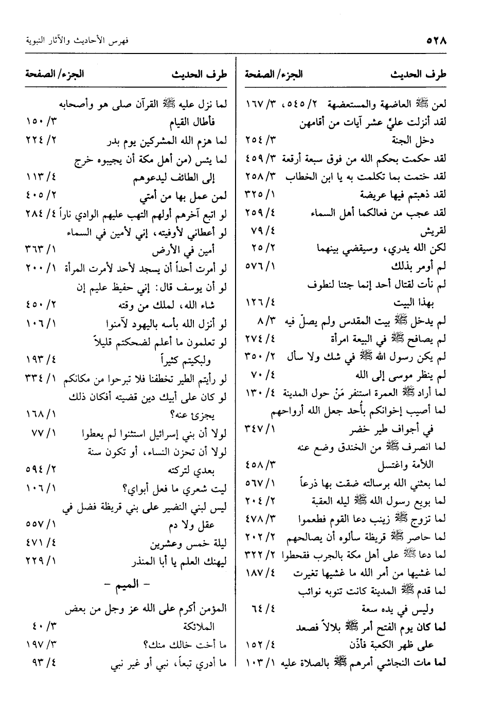 طرف الحديث الجزء/ الصفحة لعن صلّى الله عليه وسلم العاضهة والمستعضهة 2/ 545، 3/ 167 لقد أنزلت عليّ عشر آيات من أقامهن دخل الجنة 3/ 254 لقد حكمتَ بحُكم الله من فوق سبعة أرقعة 3/ 459 لقد خُتمتْ بما تكلمتَ به يا ابن الخطاب 3/ 258 لقد ذهبتم فيها عريضة 1/ 325 لقد عجب من فعالكما أهل السماء 4/ 259 لقريش 4/ 79 لكن الله يدري، وسيقضي بينهما 2/ 25 لم أومر بذلك 1/ 576 لَمْ نأتِ لقتال أحَد إِنما جئنا لنطوف بهذا البيت 4/ 126 لم يدخل صلّى الله عليه وسلم بيت المقدس ولم يصلّ فيه 3/ 8 لم يصافح صلّى الله عليه وسلم في البيعة امرأة 4/ 274 لم يكن رسول الله صلّى الله عليه وسلم في شك ولا سأل 2/ 350 لم ينظر موسى إلى الله 4/ 70 لما أراد صلّى الله عليه وسلم العمرة استنفر من حول المدينة 4/ 130 لما أصيب إخوانكم بأحد جعل الله أرواحهم في أجواف طير خضر 1/ 347 لما انصرف صلّى الله عليه وسلم من الخندق وضع عنه اللأمة واغتسل 3/ 458 لما بعثني الله برسالته ضقت بها ذرعاً 1/ 567 لما بويع رسول الله صلّى الله عليه وسلم ليلة العقبة 2/ 204 لما تزوج صلّى الله عليه وسلم زينب دعا القوم فطعموا 3/ 478 لما حاصر صلّى الله عليه وسلم قريظة سألوه أن يصالحهم 2/ 202 لما دعا صلّى الله عليه وسلم على أهل مكة بالجرب فقحطوا 2/ 322 لمّا غَشِيَها مِنْ أمْر الله ما غَشِيَها تغيرت 4/ 187 لما قدم صلّى الله عليه وسلم المدينةَ كانت تَنُوبه نوائبُ وليس في يده