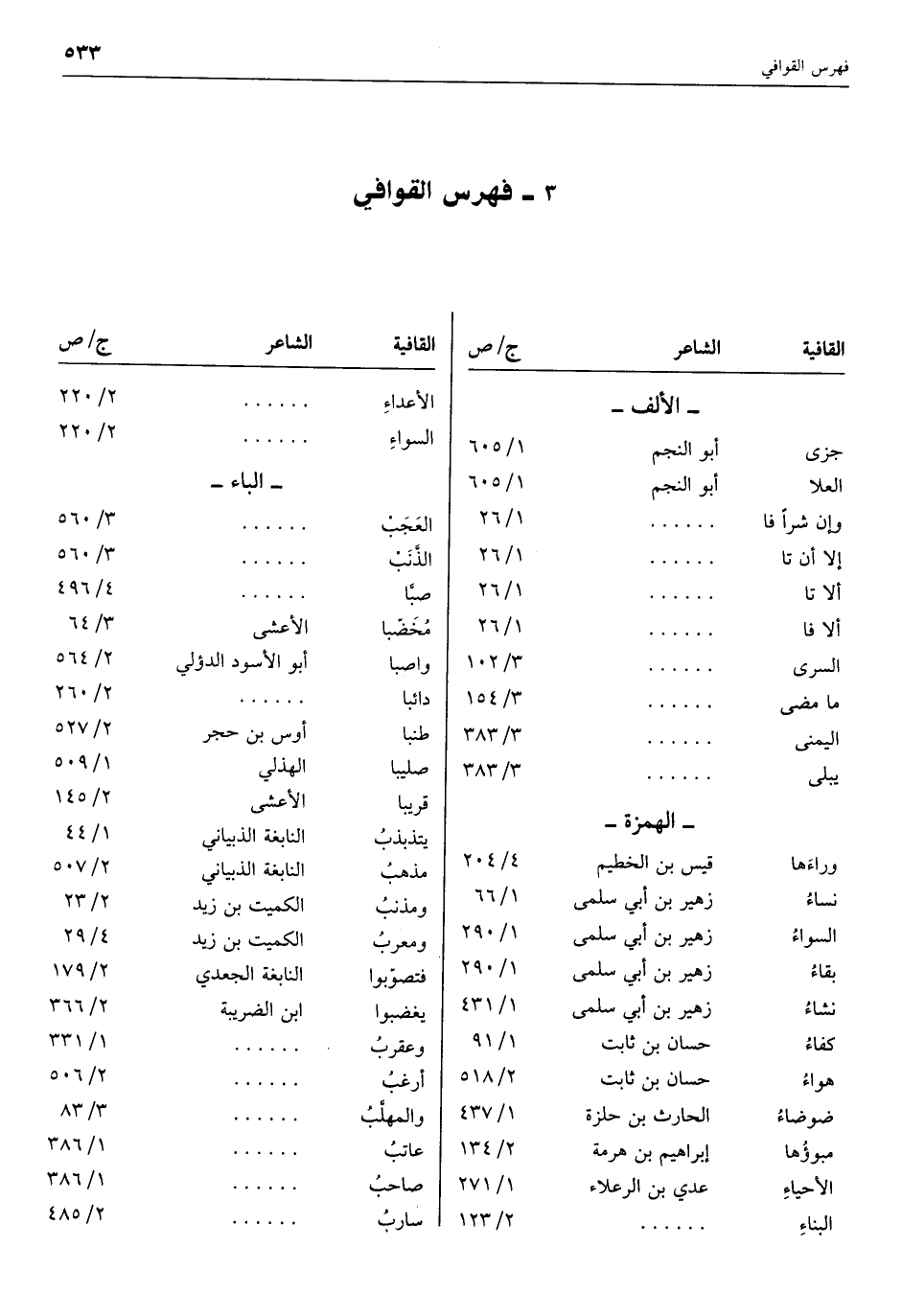 3- فهرس القوافي القافية: الشاعر: ج/ ص- الألف- جزى: أبو النجم: 1/ 605 العلا: أبو النجم: 1/ 605 وإن شرا فا:: 1/ 26 إلا أن تا:: 1/ 26 ألا تا:: 1/ 26 ألا فا:: 1/ 26 السرى:: 3/ 102 ما مضى:: 3/ 154 اليمنى:: 3/ 383 يبلى:: 3/ 383- الهمزة- وراءها: قيس بن الخطيم: 4/ 204 نساء: زهير بن أبي سلمى: 1/ 66 السواء: زهير بن أبي سلمى: 1/ 290 بقاء: زهير بن أبي سلمى: 1/ 290 نشاء: زهير بن أبي سلمى: 1/ 431 كفاء: حسان بن ثابت: 1/ 91 هواء: حسان بن ثابت: 2/ 518 ضوضاء: الحارث بن حلزة: 1/ 437 مبوؤها: إبراهيم بن هرمة: 2/ 134 الأحياء: عدي بن الرعلاء: 1/ 271 البناء:: 2/ 123 القافية: الشاعر: ج/ ص الأعداء:: 2/ 220 السواء:: 2/ 220- الباء- العجب:: 3/ 560 الذّنب:: 3/ 560 صبّا:: 4/ 496 مخضّبا: الأعشى: 3/ 64 واصبا: أبو الأسود الدؤلي: 2/ 564 دائبا:: 2/ 260 طنبا: أوس بن حجر: 2/ 527 صليبا: الهذلي: 1/ 509 قريبا: الأعشى: 2/ 145 يتذبذب: النابغة الذبياني: 1/ 44 مذهب: النابغة الذبياني: 2/ 507 ومذنب: الكميت بن زيد: 2/ 23 ومعرب: الكميت بن زيد: 4/ 29 فتصوّبوا: النابغة الجعدي: 2/ 179 يغضبوا: ابن الضريبة: 2/ 366 وعقرب:: 1/ 331 أرغب:: 2/ 506 والمهلّب:: 3/ 83 عاتب:: 1/ 386 صاحب:: 1/ 386 سارب:: 2/ 485