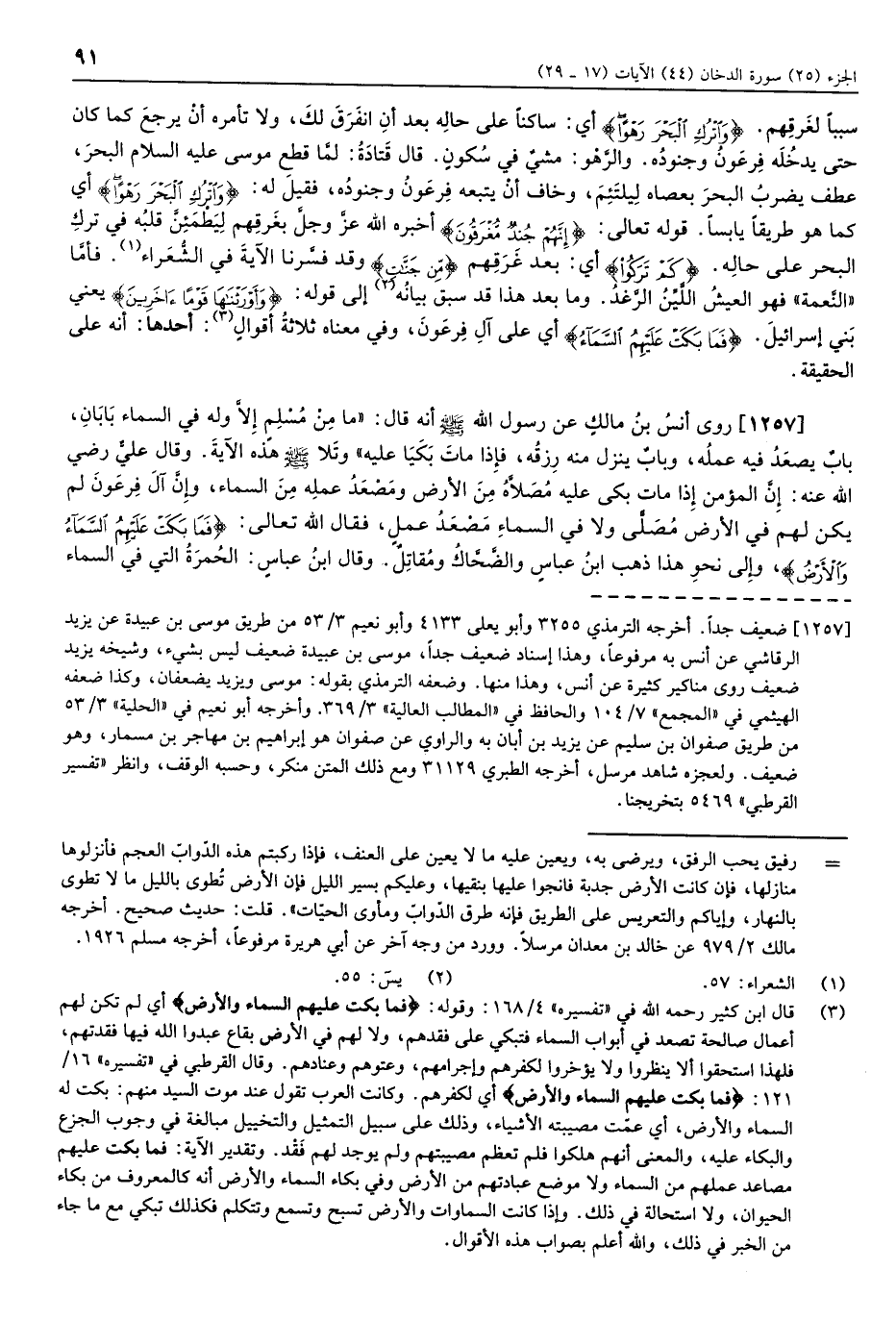 (1257) روى أنس بن مالك عن رسول الله صلّى الله عليه وسلّم أنه قال: «ما مِنْ مُسْلِمٍ إٍلاّ وله في السماء بابان، باب يصعَدُ فيه عمله، وباب ينزل منه رزقه، فإذا مات بكيا عليه» وتلا صلّى الله عليه وسلّم هذه الآية. وقال عليّ رضي الله عنه: إِن المؤمن إذا مات بكى عليه مُصَلاّه من الأرض ومَصْعَد عمله من السماء، وإِن آل فرعون لم يكن لهم في الأرض مُصَلّى ولا في السماء مَصْعَد عمل، فقال الله تعالى: فَما بَكَتْ عَلَيْهِمُ السَّماءُ وَالْأَرْضُ، وإِلى نحو هذا ذهب ابن عباس والضحاك ومقاتل. وقال ابن عباس: الحُمرة التي في السماء