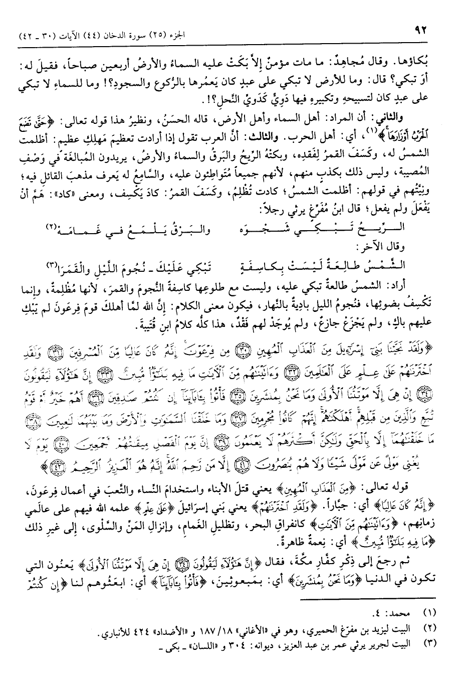 أراد: الشمسُ طالعةٌ تبكي عليه، وليست مع طلوعها كاسِفةً النجومَ والقمرََ، لأنها مُظْلِمةٌ، وإِنما تَكْسٍفُ بضوئها، فنجُومُ الليل باديةٌ بالنهار، فيكون معنى الكلام: إن الله لمّا أهلك قوم فرعون لم يبك عليهم باكٍ، ولم يَجْزَعْ جازعٌ، ولم يوجد لهم فَقْدٌ، هذا كلُّه كلامُ ابن قتيبة.