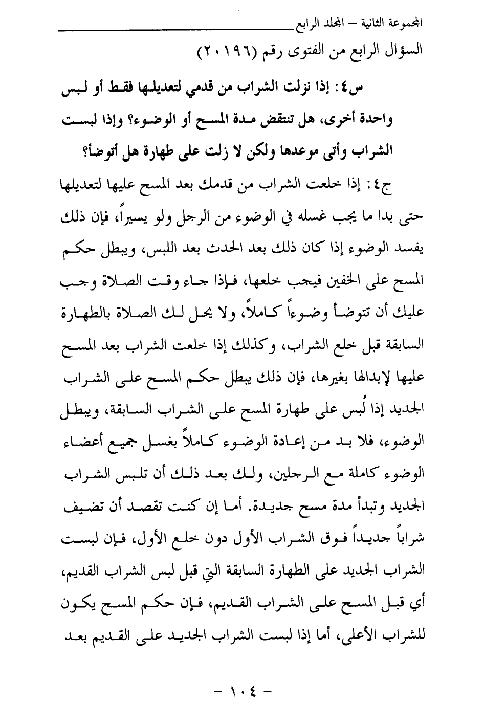 ج 4: إذا خلعت الشراب من قدمك بعد المسح عليها لتعديلها حتى بدا ما يجب غسله في الوضوء من الرجل ولو يسيرا، فإن ذلك يفسد الوضوء إذا كان ذلك بعد الحدث بعد اللبس، ويبطل حكم المسح على الخفين فيجب خلعها، فإذا جاء وقت الصلاة وجب عليك أن تتوضأ وضوءا كاملا، ولا يحل لك الصلاة بالطهارة السابقة قبل خلع الشراب، وكذلك إذا خلعت الشراب بعد المسح عليها لإبدالها بغيرها، فإن ذلك يبطل حكم المسح على الشراب الجديد إذا لبس على طهارة المسح على الشراب السابقة، ويبطل الوضوء، فلا بد من إعادة الوضوء كاملا بغسل جميع أعضاء الوضوء كاملة مع الرجلين، ولك بعد ذلك أن تلبس الشراب الجديد وتبدأ مدة مسح جديدة. أما كنت تقصد أن تضيف شرابا جديدا فوق الشراب الأول دون خلع الأول، فإن لبست الشراب الجديد على الطهارة السابقة التي قبل لبس الشراب القديم، أي قبل المسح على الشراب القديم، فإن حكم المسح يكون للشراب الأعلى، أما إذا لبست الشراب الجديد على القديم بعد